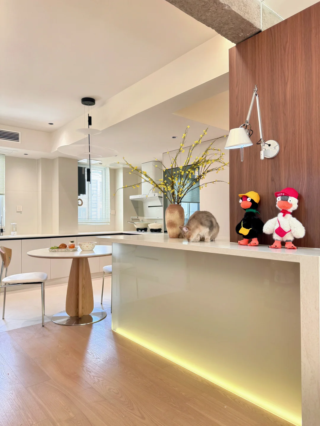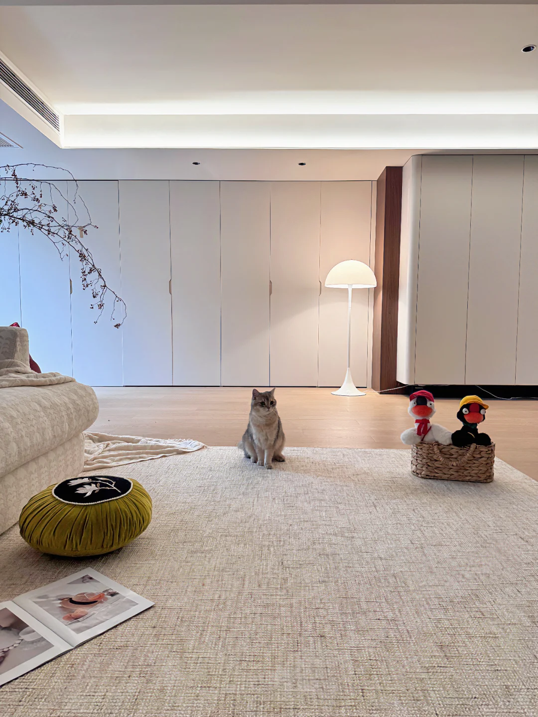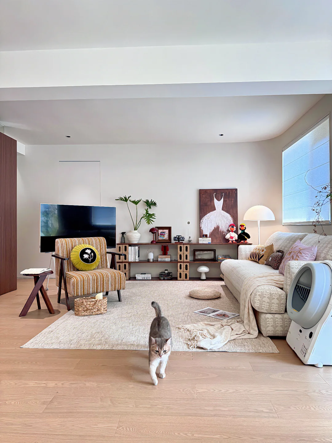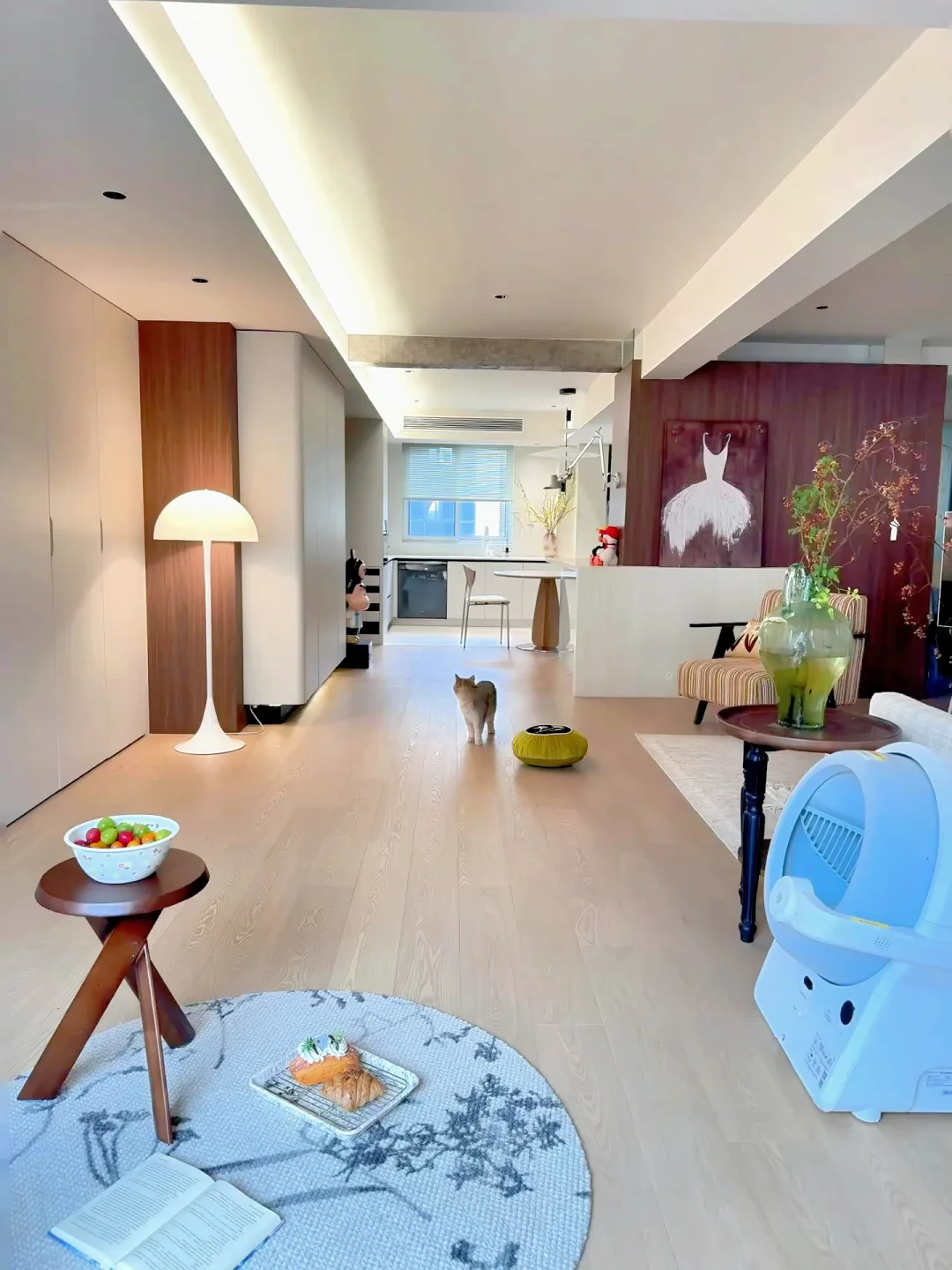 ✨ 新家入住快一年,建面122㎡、套内102㎡。 当初狠下心砸掉一间次卧,就为了换客厅这份开阔通透的松弛感。没有复杂的硬装,原木地板踩着踏实,暖黄灯光裹着温柔,越住越觉得耐看又安心。 家里有两个蹦跳的小丫头,一只黏人的小猫咪,还有满沙发软乎乎的公仔。日常吵吵闹闹,却也热闹得刚好。我总爱守在餐桌旁,看她们在地毯上追着跑,猫咪蜷在脚边打盹,柔和的落地灯漫出暖光,连空气都软乎乎的。 不用多富有,也不用多华丽。在小县城拥有这样一个满是烟火气的家,有孩子的笑声,有猫咪的呼噜声,就已经是我能想到的,最踏实的幸福了。