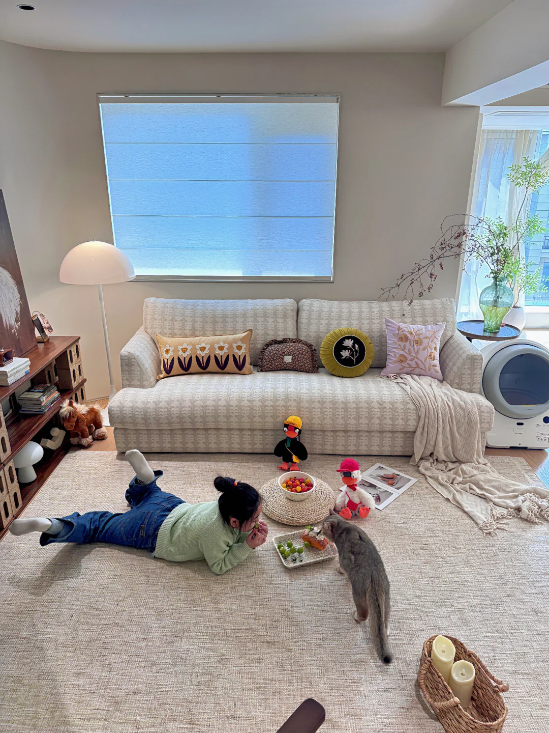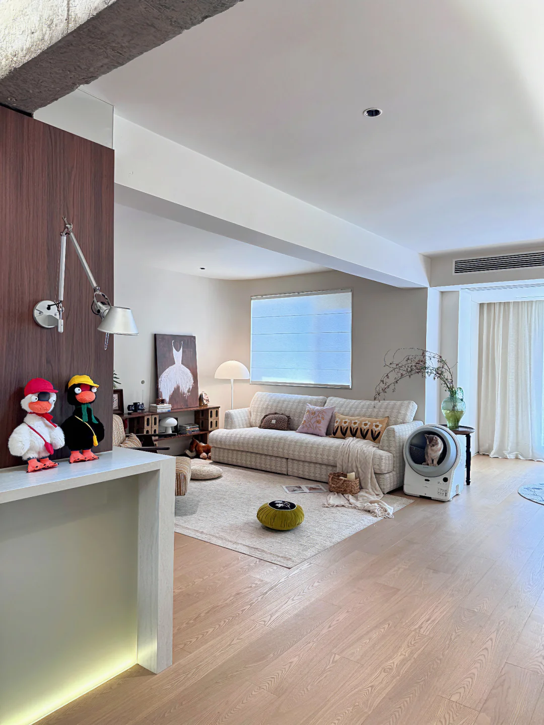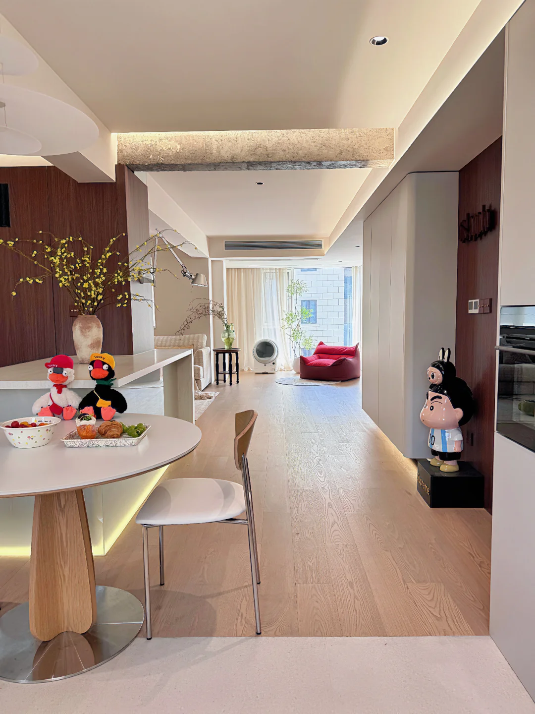 ✨ 新家入住快一年,建面122㎡、套内102㎡。 当初狠下心砸掉一间次卧,就为了换客厅这份开阔通透的松弛感。没有复杂的硬装,原木地板踩着踏实,暖黄灯光裹着温柔,越住越觉得耐看又安心。 家里有两个蹦跳的小丫头,一只黏人的小猫咪,还有满沙发软乎乎的公仔。日常吵吵闹闹,却也热闹得刚好。我总爱守在餐桌旁,看她们在地毯上追着跑,猫咪蜷在脚边打盹,柔和的落地灯漫出暖光,连空气都软乎乎的。 不用多富有,也不用多华丽。在小县城拥有这样一个满是烟火气的家,有孩子的笑声,有猫咪的呼噜声,就已经是我能想到的,最踏实的幸福了。
