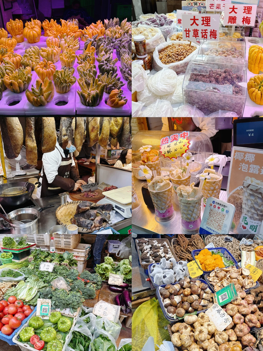 昆明的菜市场很难用文字形容,反正你就去逛吧,应接不暇的各种云南特色食材,眼睛都感觉不够用,而且最好饿着肚子去,边逛边买边吃,空着肚子进去,撑着出来。还可以把下一顿的饭都捎带上。