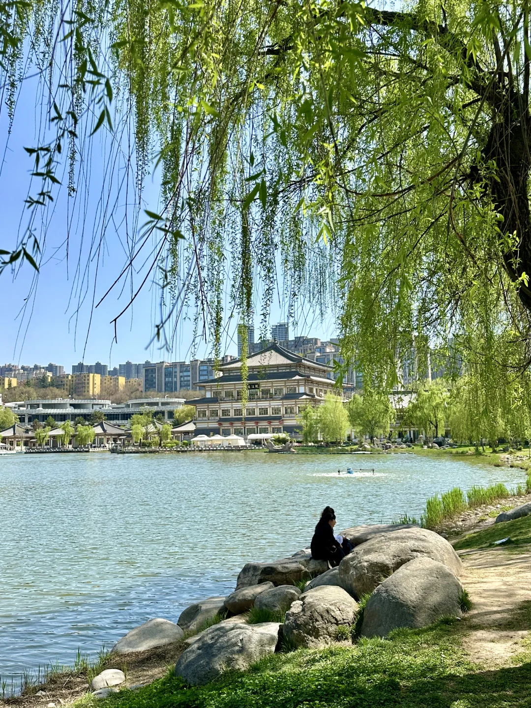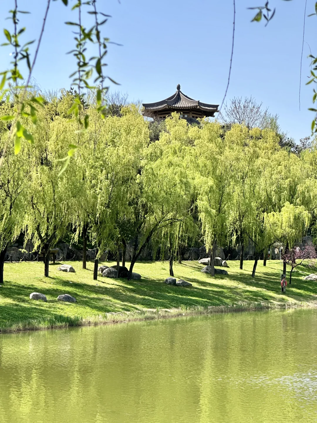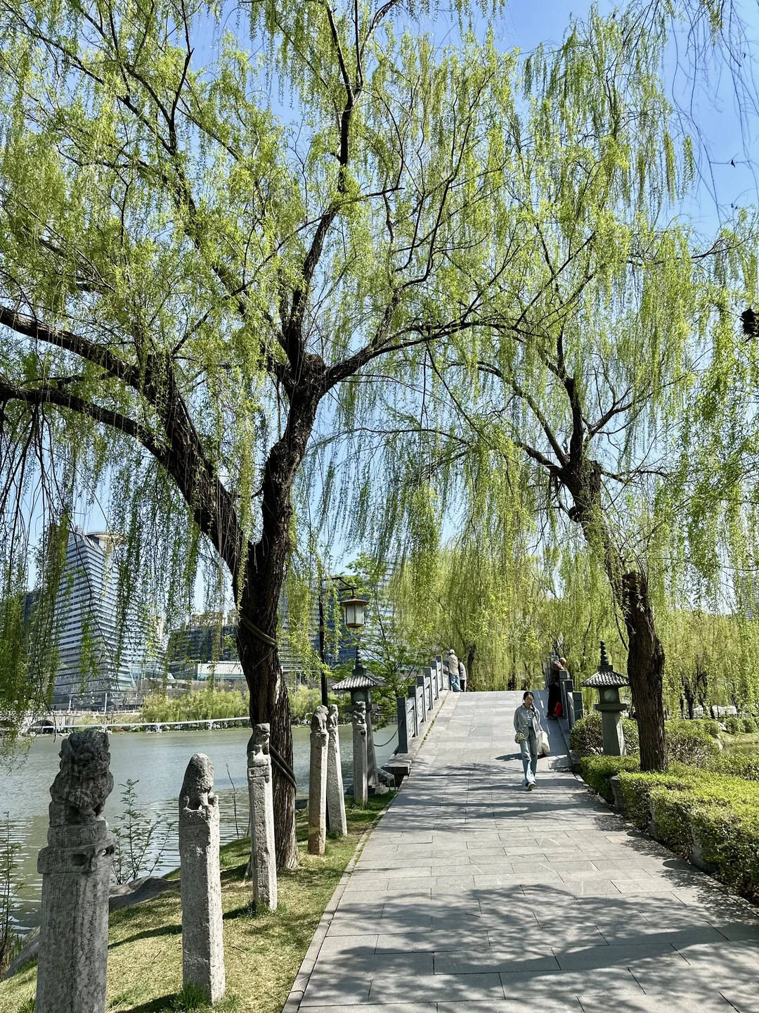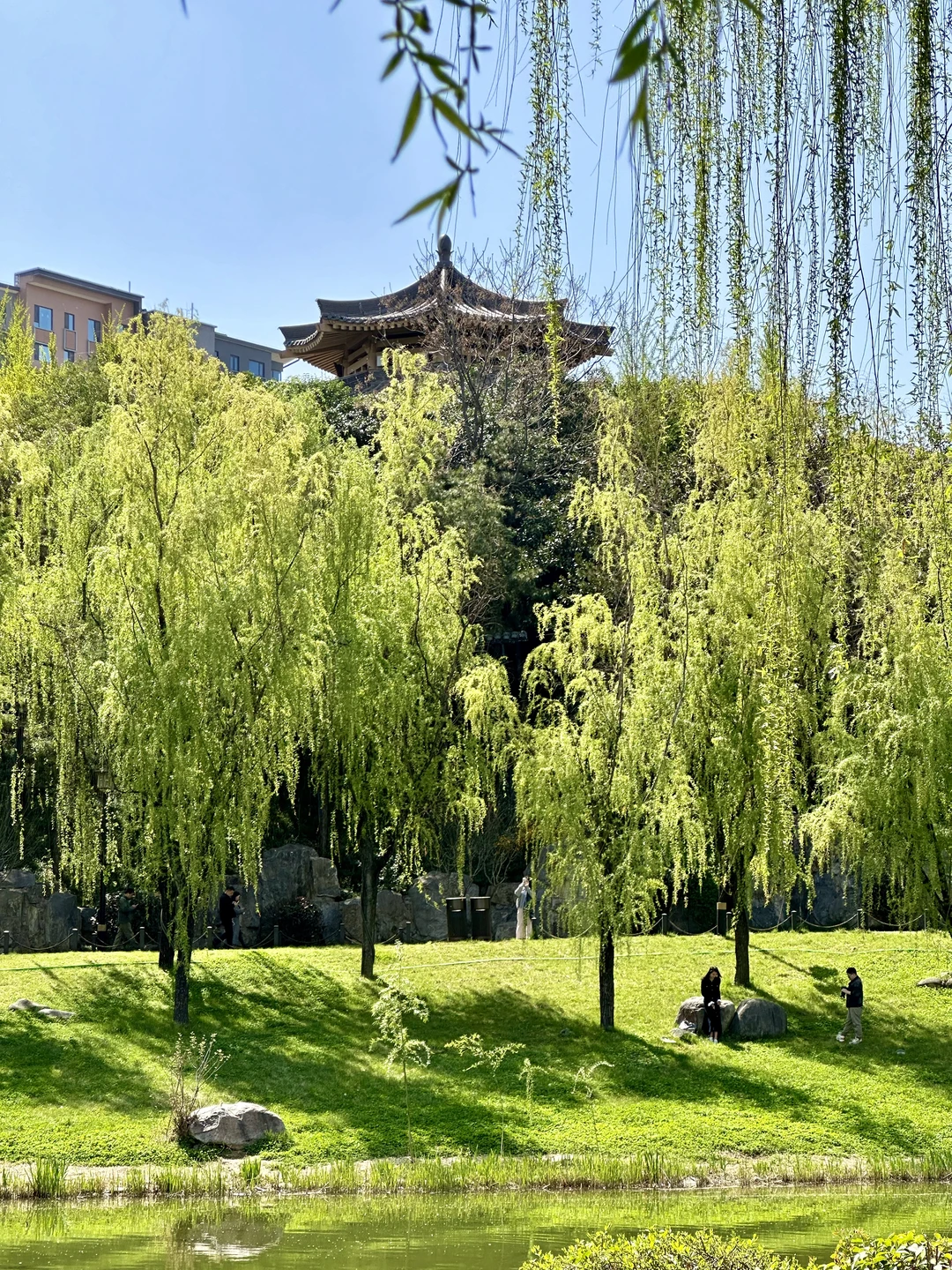 唐曲江池入水口遗址➠ unico右侧一路是拴马庄的步道上月亮桥➠芸阁码头➠长恨歌唐诗浮雕➠明皇栈桥