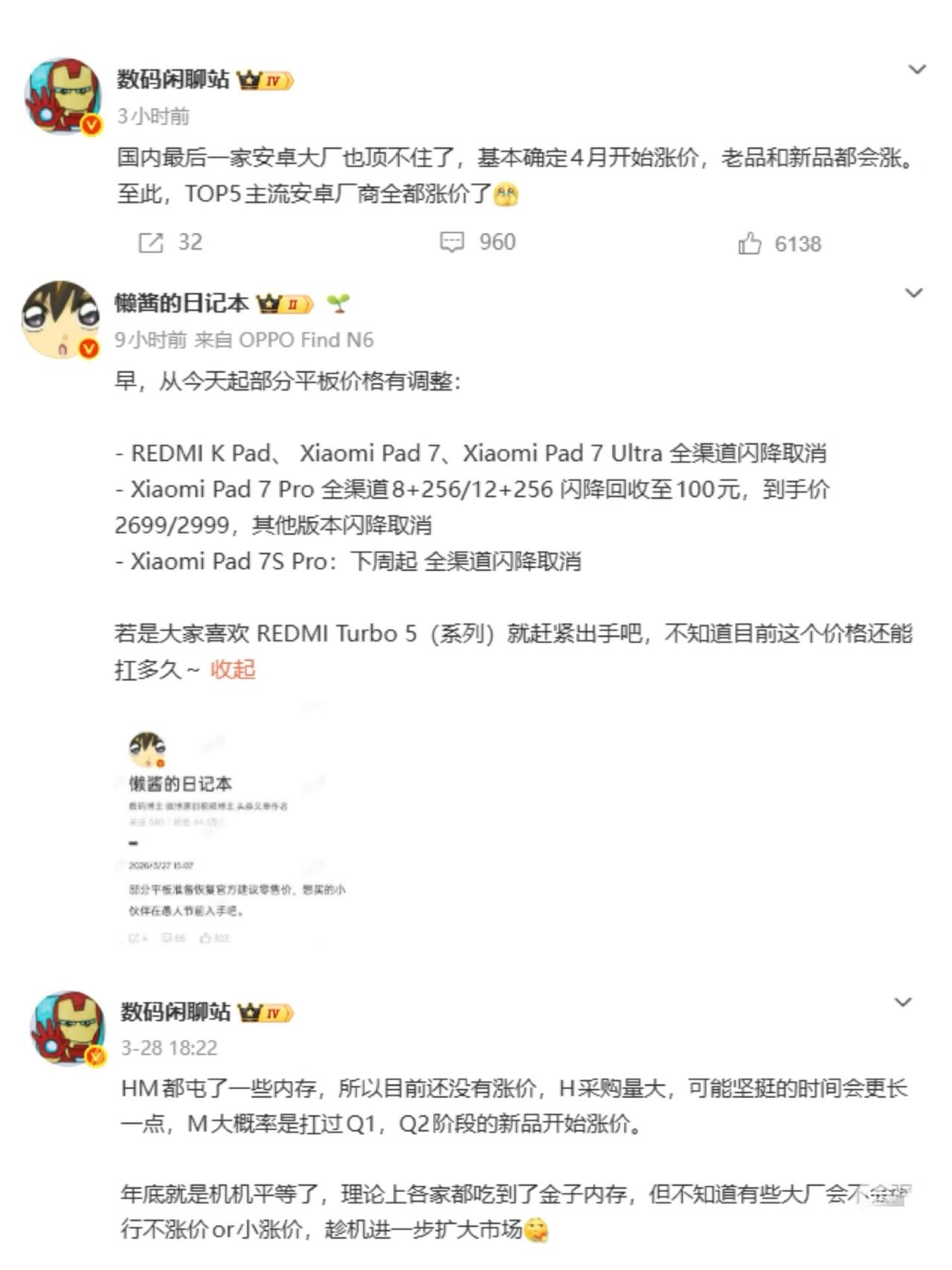 小米也要开始涨价了~! 小米平板部分产品闪降已经取消,接下来手机应该价格也要涨了~ 打算入手小米手机的,还是早点入手吧…… 手机涨价,你还打算买吗?