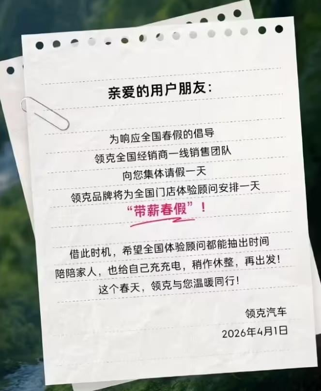 近日,多家车企给员工放春假。 今日,领克常务副总经理周钘宣布,4月1日领克全国销售一线团队安排一天的带薪春假,“3月冲刺结束,4月天气真好,都走出去陪陪家人吧”。 此前,奇瑞汽车发布内部2026年春假安排通知,将2026年4月3日安排为年假休假,与清明节法定假期连休,共计4天,春假优先使用年假,若无年假则按调休处理。 通知称“愿大家在这明媚春光里,暂放忙碌,多配家人”。