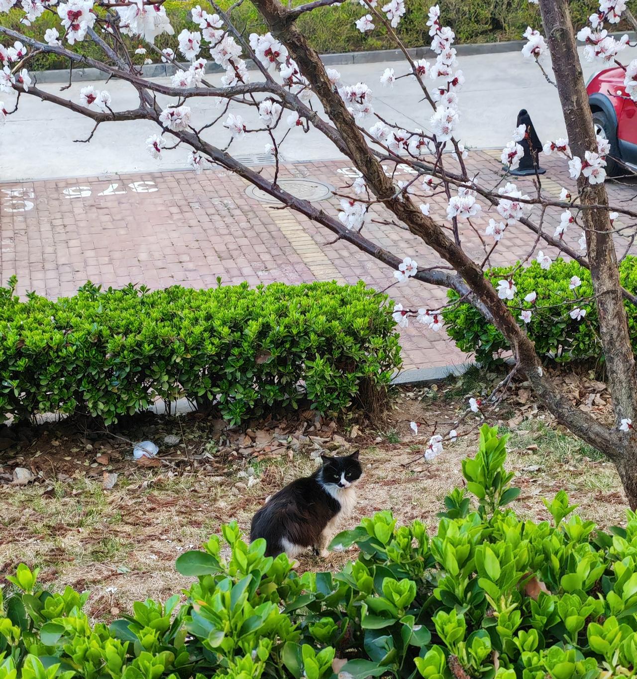 花下猫 回头望 漫步在杏花树下,休闲,我给它拍照,还很配合的回头望一望。猫咪享受春日暖阳,享受春天的芬芳。
