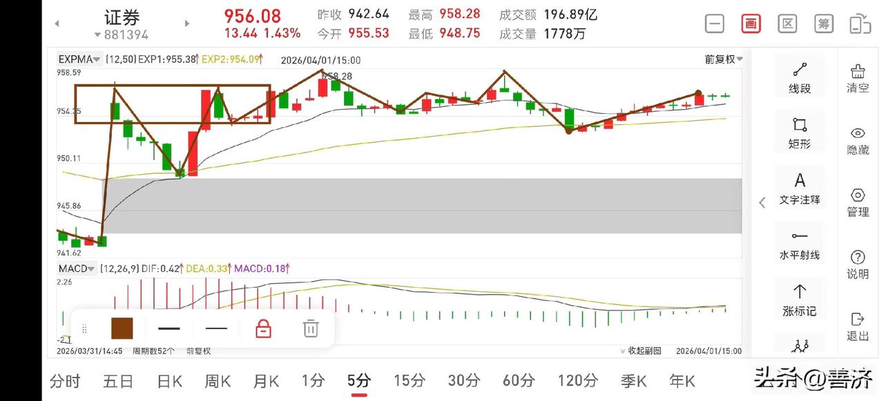 证券板块晚评(2026.4.1) 今天下午证券板块的走势是在预期之内的,此处并不会大涨也不会大跌,就是主力缓慢吸筹的过程,向上突破是迟早的事,只是走势比蜗牛还慢,没点耐心是不行的。 1.从30分钟图一上看,下午略有回落形成了30分钟的第二个二买,只要是二买,无论它走的如何缓慢,只需耐心等着就行,从全市场看,虽然今天涨多跌少,但成交量并没有显著放大,涨停个股也没有超过百只,说明市场情绪并不高,如果明天能拉出大阳线,那情绪就上来了,在此明天可继续考虑看涨。 2.从5分钟图二上看,下午就是围绕5分钟中枢做上下震荡,并扩张成了30分钟一笔,这个30分钟一笔是由9笔5分钟扩张而来,明天继续看围绕中枢做上行震荡走势,目前并无大的风险,无忧。 总之,走势还是正常的,大盘也回补了上方缺口,那证券明天能回补吗?拭目以待吧!市场板块分析 券商策略解读