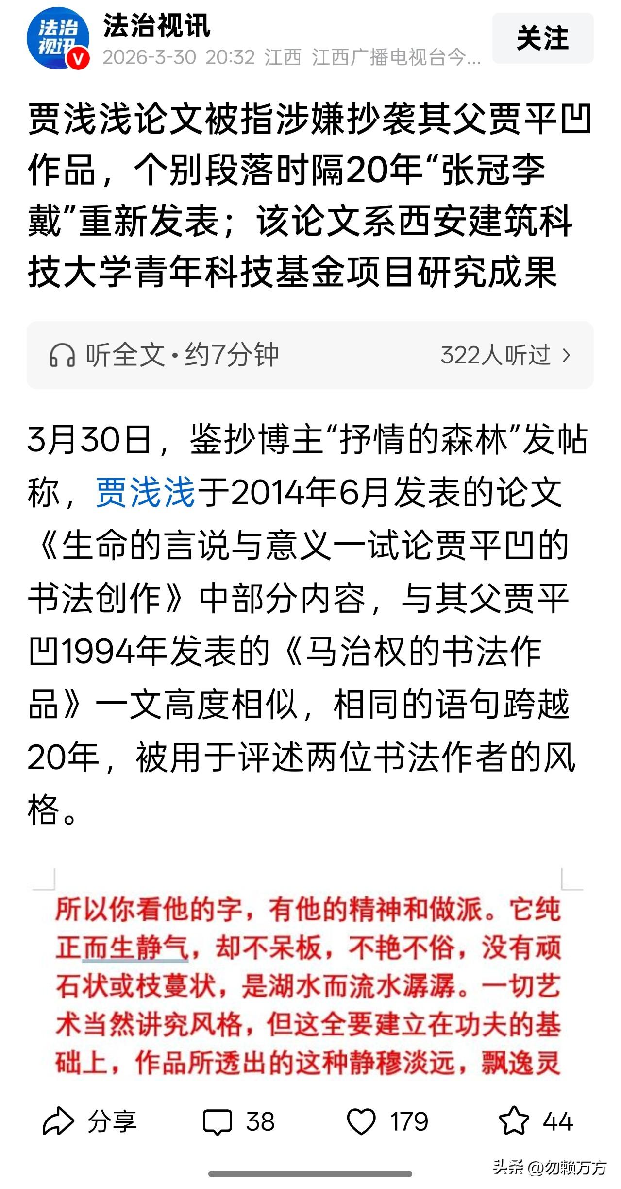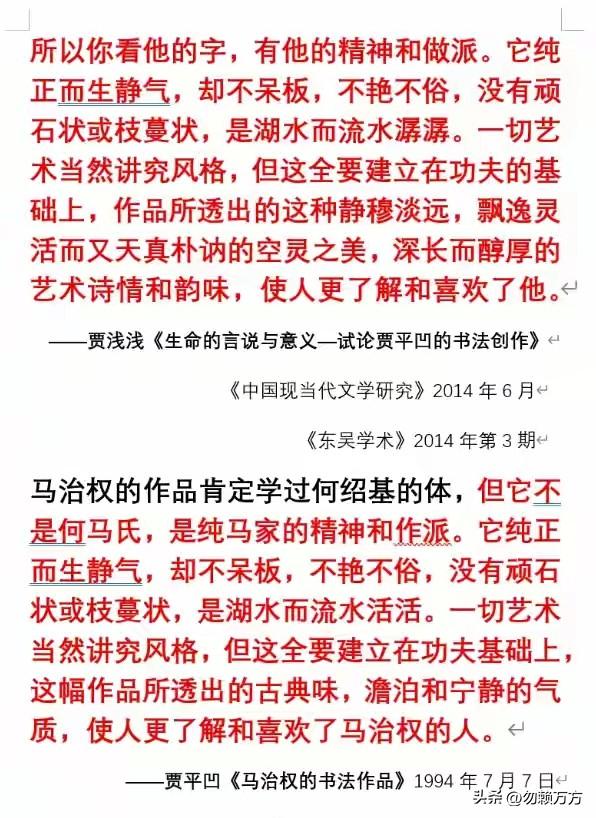 近日,有博主发文质疑某诗人的论文涉嫌抄袭其父老贾早年发表的文章。贾女的论文是夸赞其父的书法,而贾父的文章是夸赞另一位书家马某的书法。大家可以根据图二自行判断两篇文章的差异。 那么,为什么论文发表十几年没被人质疑过呢?我觉得可能是因为文章功用性不足。比如你如果每天使用一把菜刀,然后在别处发现一把一模一样的,下意识就会想这是不是我那把刀?相反山坡上的两棵树没人会注意它们有多像。[大笑] 谁也无法预知未来,如果能预料到自家孩子后来会用这篇文章,那老贾可能不会发表,留着名正言顺地传给女儿多好,反正文章辨识度也不高,你说是夸贾也行,说是夸马也行,当然,除了被夸的人也没多少人会在意。 说起来老贾在年轻时也有过挺大争议,但还是有不少人肯定他的才气。如今又因家人被网友提及讨论,也让人感慨世事无常。