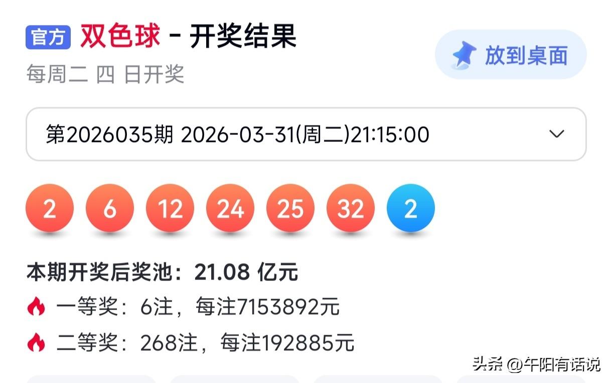 双色球26036期号码共享,红色球防2尾继续热开,蓝色球防大号反弹 开奖快讯 双色球26035期开奖号码为: 02 06 12 24 25 32 + 02 红色球号码走势 在上期奇数号码再次爆发,奖号奇偶比开出5:1的比值后,本期偶数号码迎来反弹,开出了五个奖号。其中2尾号码热度最高,开出了三个奖号,依次为02、12和32。 最近一段时间,2尾号码热度非常高,虽然开出数量不能与3尾号码相比,不过稳定性却是非常高,曾连续开出了八期。 随后出现了短暂调整,开出后便迅速进入热开状态,本期直接开出三个奖号。由于当前2路号码热度较高,预计接下来继续热开的可能性很大。 近期尾数热度最高的当属3尾号码,不仅单期热度较高,而且整体热开持续周期较长。尤其是在最近几期,曾在四期内热开出十个奖号,热度达到巅峰。 不过随后3尾号码便进入到回调期,连续两期出现断区。由于3尾号码热度过高,预计接下来继续回调的概率非常大。 蓝色球号码走势 本期蓝色球奖号开出了号码02,继续在小号区域连续开出。本期午阳判断小号连开的概率较大,重点关注了小号01、04和07,结果开出了02。 本期奖号在间隔两期之后,再次开出了02,由上期奖号07移至02,势能拉满。加上小号已连续开出七期,预计接下来大号反弹的概率较大。 双色球26036期晒号 红色球: 02 04 11 16 19 21 22 25 29 蓝色球: 12 14 16 精选一注 02 11 19 21 22 25 + 12