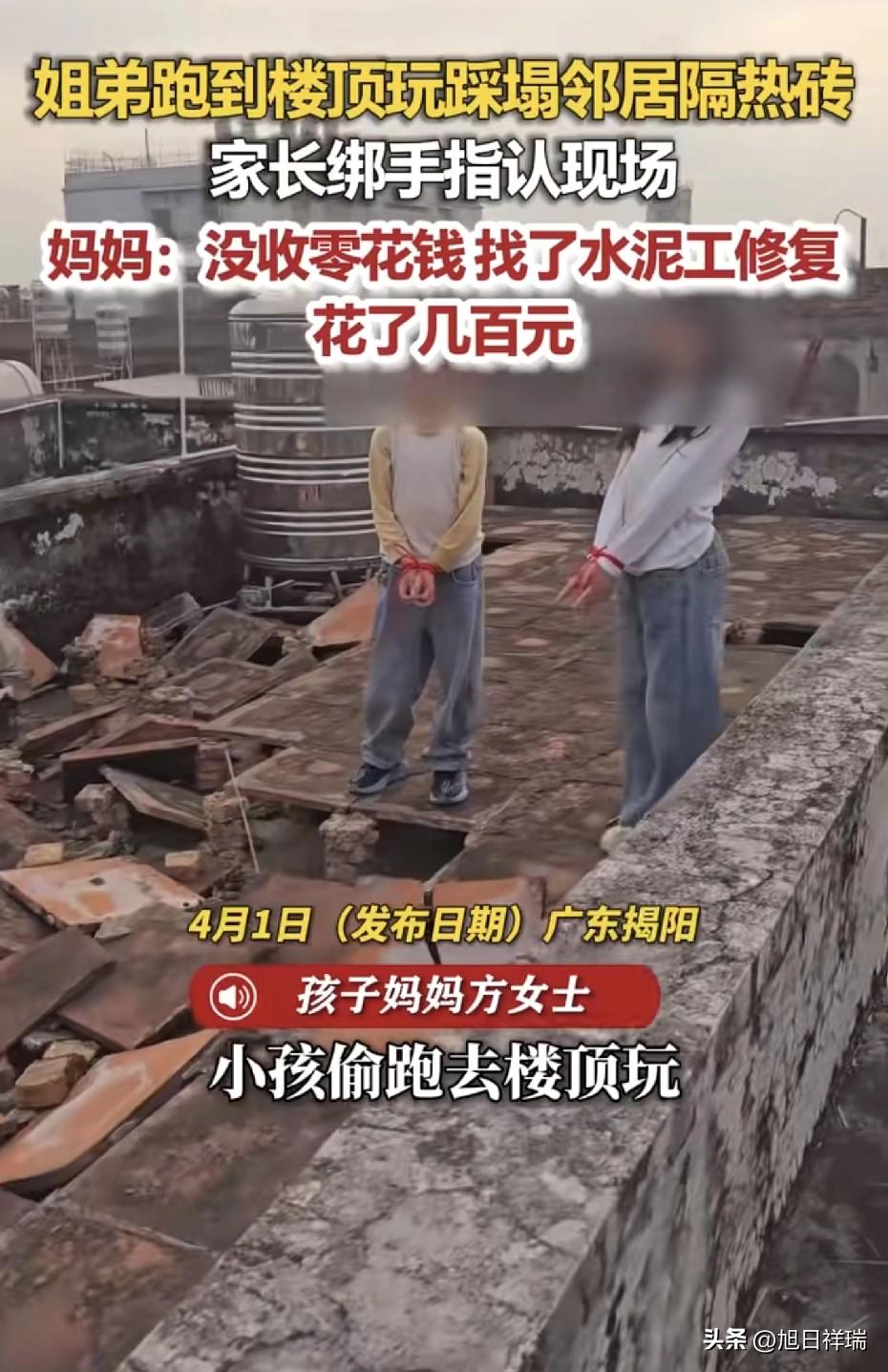 这家长太明事理了!俩姐弟偷偷跑别人家楼顶疯玩踩塌隔热砖,家长没护短反而绑手指认现场,没收孩子零花钱找水泥工修复花了好几百块。 真的越看越解气,终于见着不护短的家长了。 就是那种老小区,楼顶各家铺了隔热砖。俩孩子,姐姐带弟弟,估摸着也就一二年级,放假在家大人没看住,偷偷摸到楼顶上疯跑玩。 小孩子玩起来哪管那么多,踩来踩去,把人家好几块隔热砖给踩塌了,碎得不成样子。 邻居肯定闹心啊,好好的东西被弄坏了,找上门来。 换有些家长,张嘴就是“孩子还小,不懂事”,随便赔个几十块钱就想糊弄过去。但这家的爸妈没这样。 他们先认认真真给邻居道了歉,转头就把俩孩子拉到楼顶去,让他们亲眼看看自己闯的祸——还把孩子手指绑了一下,也不是要打要骂,就是让他们记住这个事,不能当没发生过。 后来他们自己找了水泥工,把砖修好了,花了好几百块。 这钱也不是爸妈直接掏了就算了,要从俩孩子的零花钱里扣,一点点扣完为止。 我就觉得,这才是真教育。孩子闯了祸,你要是光替他擦屁股,他永远不知道轻重。 让他亲眼看着自己弄坏的东西,再用自己攒的零花钱去赔,他才能真的长记性。 平时见多了那种“他还是个孩子”的家长,你跟他说理,他还觉得你小题大做,能把人气死。 所以看到这个,真觉得舒服——原来还是有家长愿意认认真真教孩子担责任的。 你们遇到过那种特别护短的家长吗?
