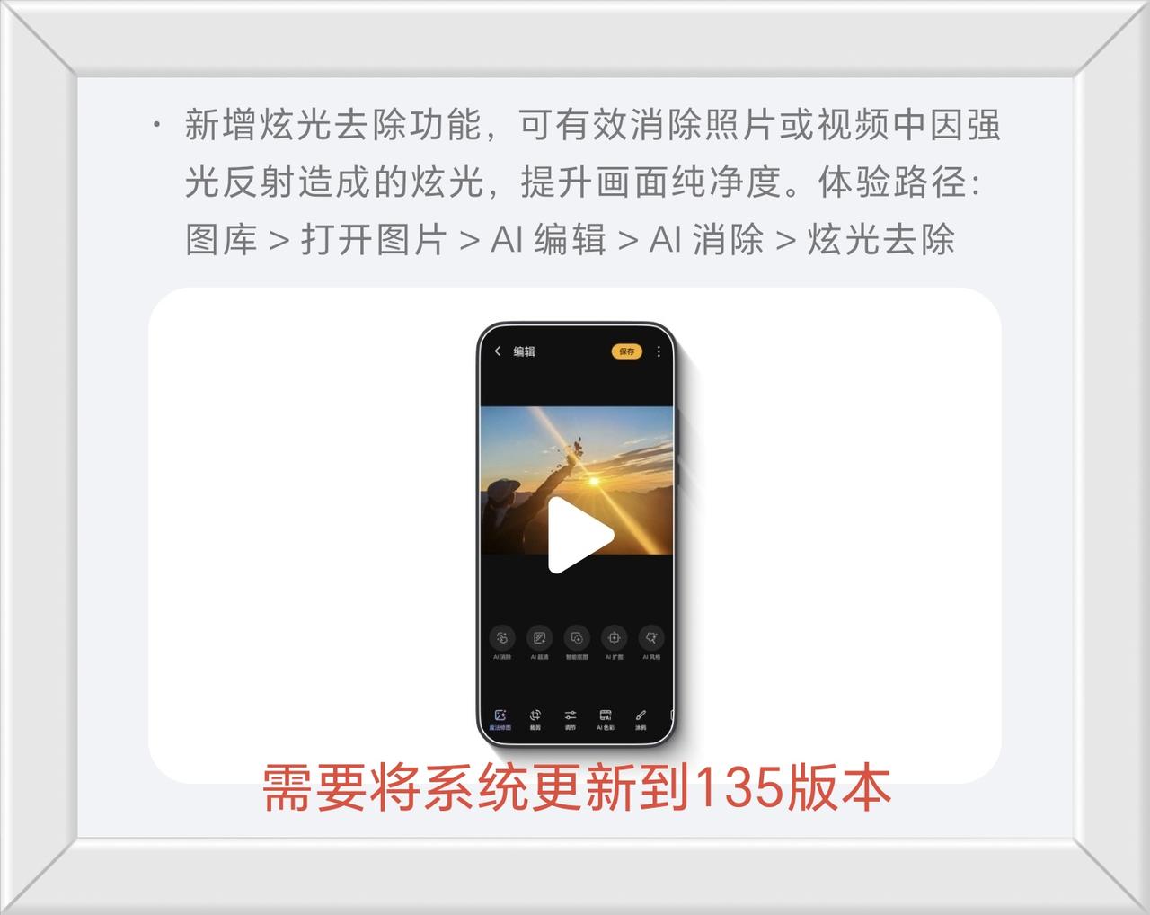 荣耀magic7pro是可以一键去除炫光的! 平时拍照片尤其是对着强光或者是晚上拍路灯,就会出现炫光的情况,这种炫光场景偶尔出两张还有些意境,但是太多了就影响照片质量了。 荣耀magic7pro更新135版本后是可以对炫光进行一键消除的,具体操作 图库-打开图片-AI编辑,-AI消除-炫光去除就可以了。对此不知道小伙伴们怎么看呢?