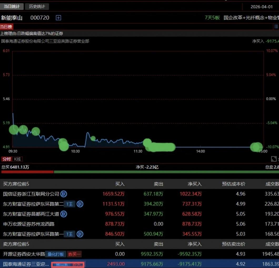 佛山系9100万地板狂逃! 今天新能泰山开盘下跌兑现,尾盘跌停。 盘后龙虎榜