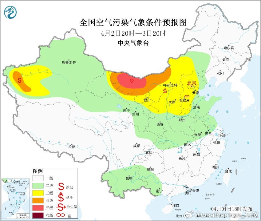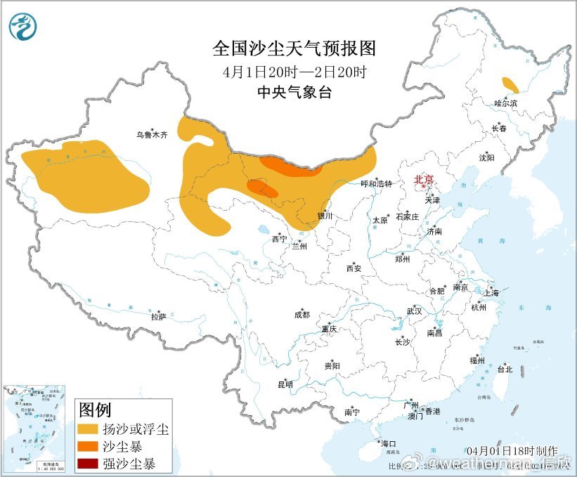 受冷空气大风影响,预计4月1日20时至2日20时,新疆东部和南部、青海西北部、内蒙古西部、甘肃西部、宁夏北部等地的部分地区有扬沙或浮尘天气,其中,内蒙古西部、甘肃西部等地局部有沙尘暴。