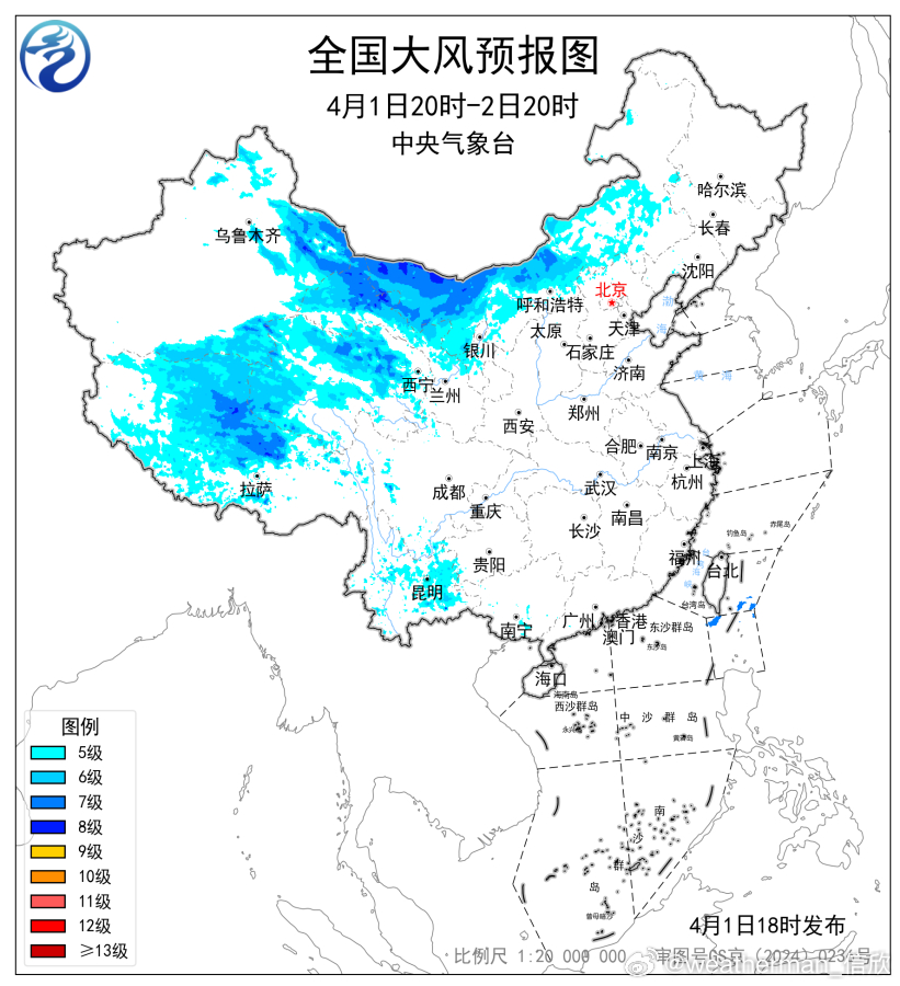 预计,4月1日20时至2日20时,新疆东部和南疆盆地、内蒙古大部、甘肃中西部、宁夏北部、青海大部、西藏北部、云南东部等地部分地区有4~6级风、阵风7级,内蒙古中西部、甘肃河西、西藏北部、青海北部等地部分地区有7~8级风、阵风9级。