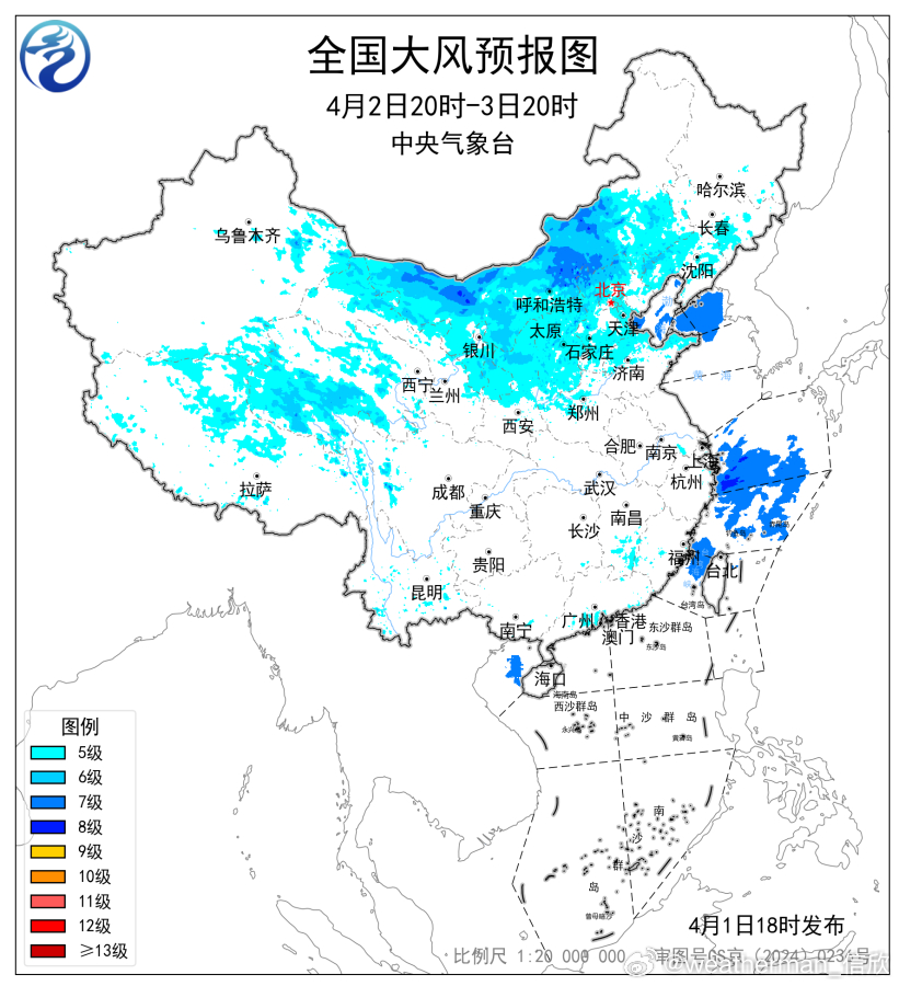 预计,4月2日20时至3日20时,新疆东部、内蒙古大部、西北地区中东部、华北、山东北部、东北地区中南部等地部分地区有4~6级风、阵风7~9级,内蒙古中部、山西北部、河北北部、北京西部等地局地阵风可达10级以上;渤海、渤海海峡、黄海北部海域、东海大部海域、台湾海峡将有7~8级风、阵风9级。