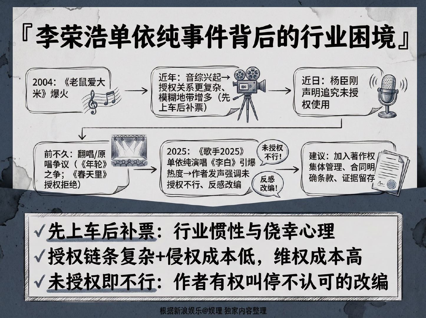 律师称音乐维权成本高于侵权成本 李荣浩这次维权的最大意义是什么?不是为了赔偿金,而是为了让行业明白:作为原创作者有权利叫停任何不喜欢的改编和演唱,这是受法律保护的绝对底气!希望这次事件能推动音乐行业更加规范,让“先上车后补票”的现象成为过去,让原创作者得到应有的尊重!音乐版权先上车后补票现象