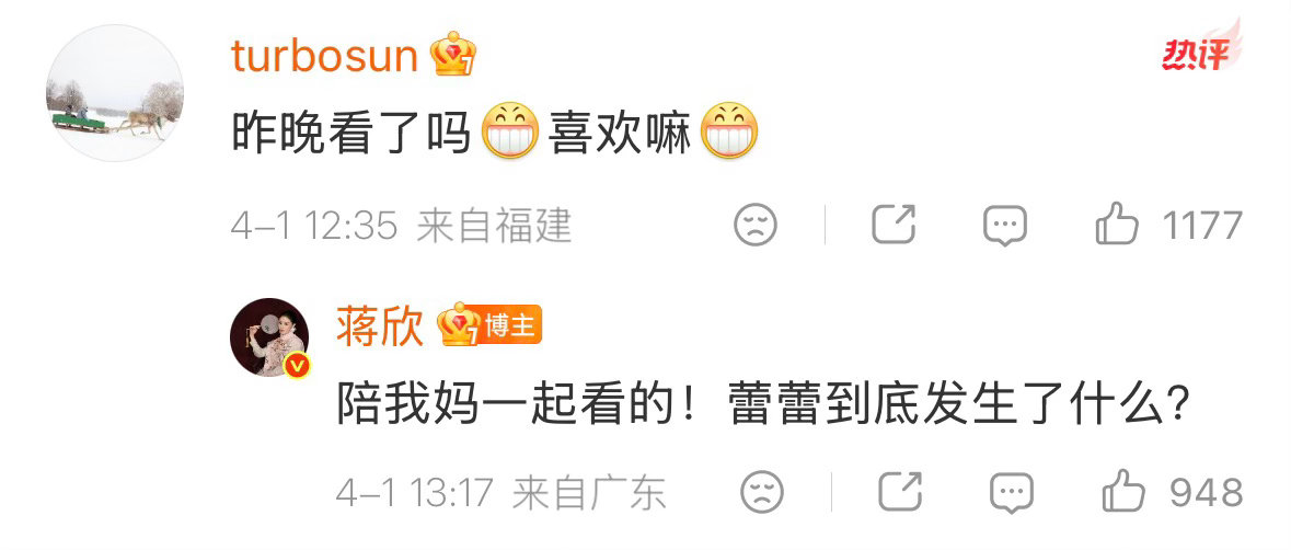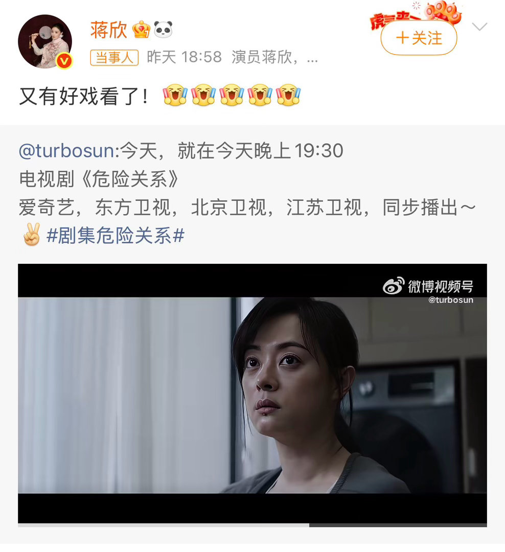 蒋欣陪妈妈看孙俪新剧孙俪回应蒋欣 转发孙俪微博,为其新剧《危险关系》宣传打call。4月1日,孙俪在线互动回应蒋欣,发问“昨晚看了吗喜欢嘛”,蒋欣则透露自己是陪妈妈一起观看的。“娘娘”们梦幻联动啦~