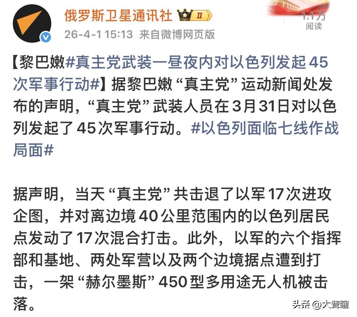 真主党武装强势反击以色列! 真主党武装表示,昨天一天对以色列发动了45次打击行动,打击了6个以军指挥所,两处军营和军事据点,同时还击退了以军多达17次的进攻。 目前,以色列面临与伊朗、真主党武装和胡塞武装的多线战争模式,以军的压力可想而知。