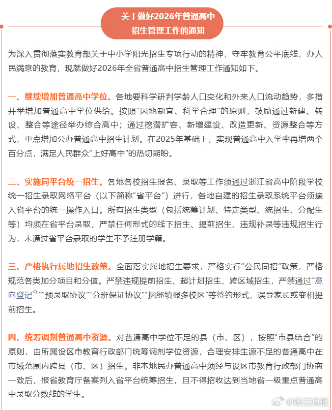 为深入贯彻落实教育部关于中小学阳光招生专项行动的精神,守牢教育公平底线,办人民满意的教育,现就做好2026年全省普通高中招生管理工作通知如下。