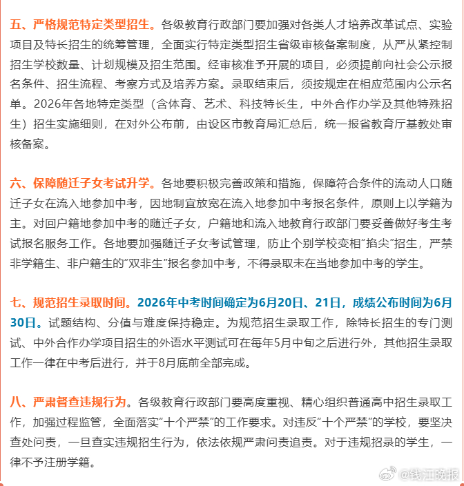 七、规范招生录取时间。2026年中考时间确定为6月20日、21日,成绩公布时间为6月30日。试题结构、分值与难度保持稳定。为规范招生录取工作,除特长招生的专门测试、中外合作办学项目招生的外语水平测试可在每年5月中旬之后进行外,其他招生录取工作一律在中考后进行,并于8月底前全部完成。