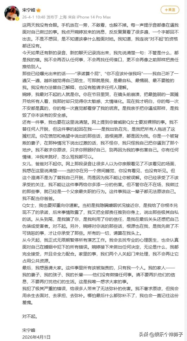 前女友是周迅 前妻是齐溪 妻子是张婉婷 说实话,感觉宋宁峰并不算帅气,还挺有女人缘。 另外,宋宁峰和张婉婷夫妇参加节目时,经常的争吵,其实,完全可以理解,反而觉得挺真实,后续还经常秀恩爱,感觉还挺幸福,毕竟也生了二胎。 看到狗仔的爆料,以及晒出的语音,一开始不太相信,尤其是带着女儿出轨,简直刷新了三观。 万万没想到,4月1日,宋宁峰发长文道歉,而且还承认出轨,该说不说,态度非常的诚恳,堪称忏悔录,然而,有些错误,仅仅靠悔改也无法弥补。 只能说,人不可貌相,看着老实巴交,憨厚老实又负责的好男人,竟然做出这种糊涂事。 对于宋宁峰来说,别的都好办,最多就是塌房,事业毁了,家庭散了,然而,女儿这一关,估计很难过,心灵上如何承受。 慢慢长大了,内心会是怎样的感受,这种伤害很难弥补。 此外,300块的债务,还要向小三借,这得有多落魄呀! 宋宁峰的做法,确实难以理解,然而,狗仔也不太地道,如此曝光,一下子伤害好多人,于心何忍呢!