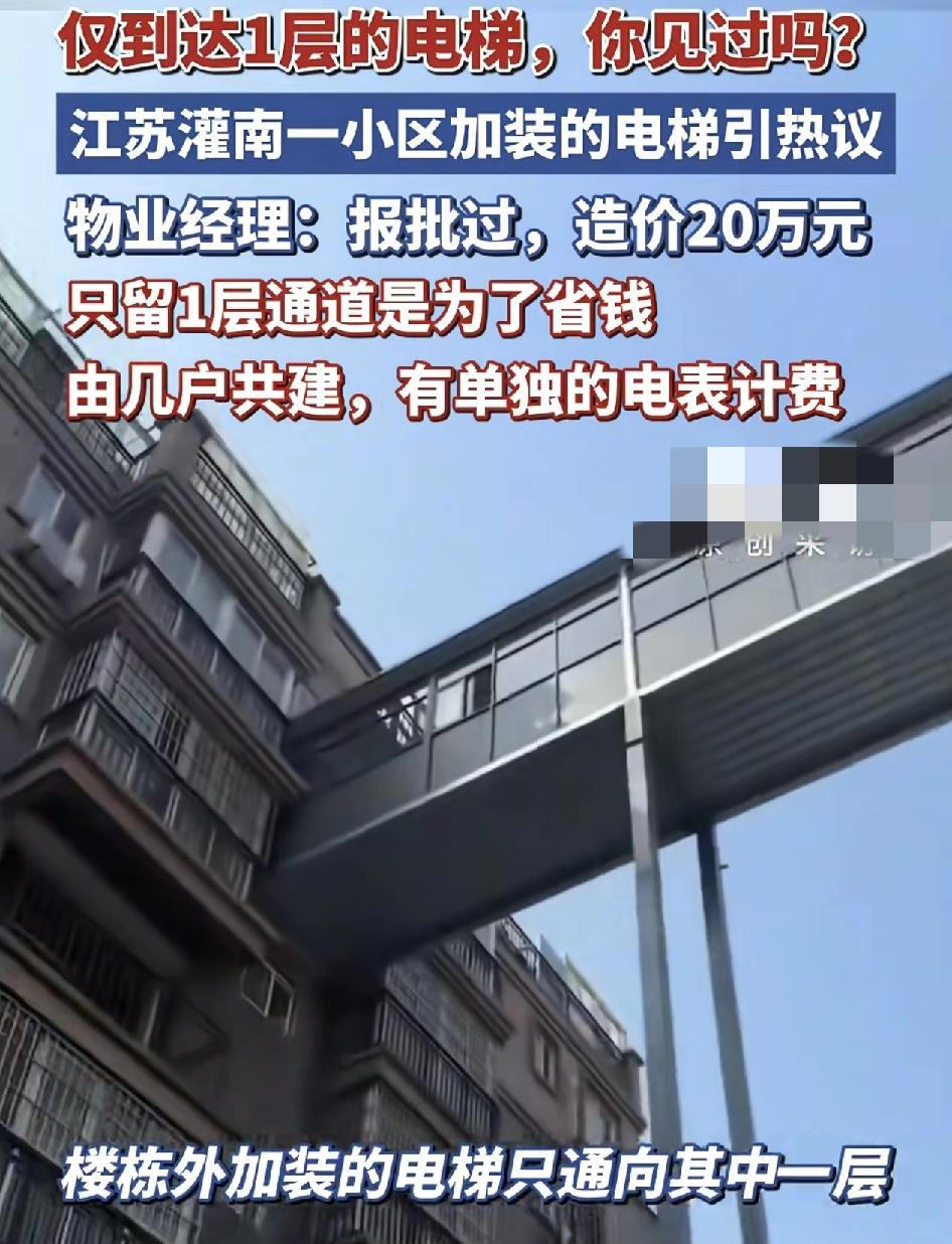 江苏一小区的外加装电梯只通达一层,引发了网友们的广泛热议,可以看到这部电梯只通达小区的第6层。小区的物业回应,该部电梯是已经报备过的,总造价才20多万元。之所以这样设计是为了省钱钱该小区一二层为商户,3~6楼为居民,六层以下的居民,乘坐电梯到达6楼之后,再往下走楼梯,总共也就四五户的居民乘坐这部电梯,有各自的电表分别计费。每个月的电费大家平摊。因为如果每一层都留通道的话,造价要高达50多万元。这种电梯的设计,既满足了高层的居民,又不需要低层的居民费心。