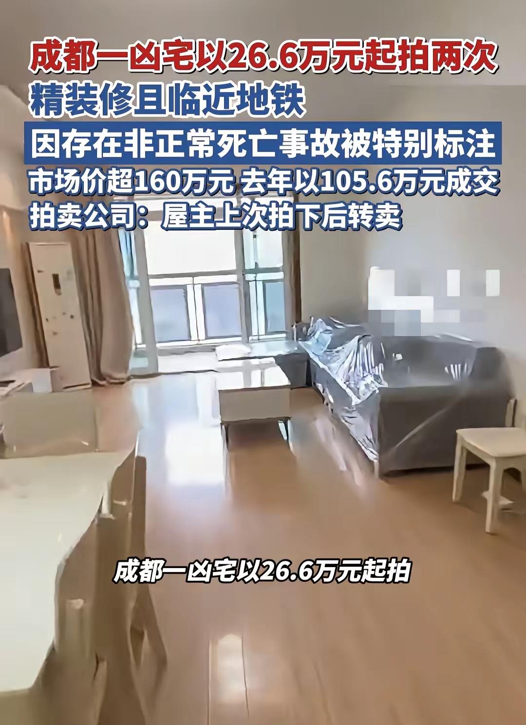 这房子是真“火”了,火到连鬼看了都得摇头! 成都一套89平的房子,短短半年被当成“烫手山芋”来回倒腾了三次!今天刚刷到的消息,这套位于成华区双庆路的“凶宅”又上架拍卖了,起拍价直接砸到了26.6万 。 为啥说是“又”?因为这老哥的经历简直比电视剧还狗血。 这套89.70平方米的精装两居室,位置其实好得没话说,万年场、双桥路双地铁加持,3公里范围内沙河公园、多宝寺公园、塔子山公园三个公园环绕,离万象城商圈、东郊记忆和建设路小吃街都不远。 同小区同户型的房子,市场评估价妥妥的160多万,它却在短短半年内三次登上拍卖台,价格从第一次的105.6万元一路跌到现在的16.6万元,降幅超过九成。2024年屋里发生的那起非正常死亡事件,像一道无法抹去的符咒,死死钉在这套房子身上,让它成了谁碰谁后悔的烫手山芋。 第一次拍卖在2025年11月,26.6万的起拍价一挂出来,92人直接杀进竞价场,4000多人设置提醒,围观人数更是突破20万。“捡漏”的念头在每个人心里疯狂滋长,谁都觉得自己能接住这个便宜。 经过数百轮激烈竞价,最终有人以105.6万元拿下,差不多是起拍价的四倍。可戏剧性的是,这位买家刚完成过户,转头就把房子重新挂了出来,理由是评估后担心市场情况,说白了还是心里发怵,不敢真住进去也不敢长期持有。 2026年1月,第二次拍卖来了,标题直接标注“凶宅二次转卖”,起拍价依旧26.6万。这次热度虽降了些,还是有24人报名,6.5万人围观,经过52轮竞价和28次延时,最终以96.6万元成交,比第一次少了9万。 本以为这次总算能尘埃落定,结果更绝——拍下的买家居然因为凑不齐尾款,只能选择悔拍,5万元保证金直接打了水漂,房子过户再次泡汤。 拍卖公司工作人员后来证实,这位买家本来打算自住,还琢磨着重新装修换个风水,可真要掏钱时,家里人集体反对,加上自己心里那道坎始终过不去,最终只能认栽。 4月1日,第三次拍卖信息一挂出来,起拍价直接从26.6万降到16.6万,降幅10万。截至当天上午,只有3人报名,1395人设置提醒,2.5万人次围观,和第一次的火爆场面比起来,冷清得不是一星半点。这房子的命运,像被按下了循环键,每次看似要成交,最后都以各种理由回到原点。 背后的原因其实不难琢磨。凶宅的标签带来的不只是心理上的膈应,还有实实在在的现实问题。自住的话,每天进进出出都得想起曾经发生的事,夜里稍微有点动静就容易疑神疑鬼,长期下来谁都扛不住。 出租更麻烦,租客一旦知道是凶宅,要么直接拒绝,要么压价压到离谱,就算租出去了,也可能因为心理压力中途退租。转手更是难上加难,除非遇到同样想“捡漏”的人,否则正常市场里根本没人愿意接盘,就算接了,也大概率会像前两位买家那样,要么后悔要么资金出问题。 更有意思的是,这房子的三次拍卖,像一面镜子,照出了当下楼市里各种复杂的心态。第一次92人疯抢,是典型的“低价诱惑”心理在作祟,总觉得自己能克服心理障碍,能捡到天大的便宜。 第二次24人报名,热情减退但仍有期待,是抱着“也许没那么可怕”的侥幸心理。第三次仅3人报名,更多人开始理性看待,明白这便宜不是那么好占的,背后藏着的风险和麻烦,可能比省下的钱还要多。 法拍房市场里,凶宅一直是个特殊的存在。价格往往只有市场价的一半甚至更低,看似性价比超高,实际隐藏的风险却远超普通房产。除了心理层面的问题,还有法律风险、产权纠纷、欠费问题等等。 前两位买家的经历已经给出了深刻教训,就算你胆子大、不信邪,也得考虑清楚后续的居住成本、转手难度和可能面临的各种麻烦。 这套成都双庆路的凶宅,从105.6万的成交价跌到16.6万的起拍价,半年内三次拍卖,每次都以失败告终,它的故事还在继续,4月14日的第三次拍卖结果还未可知。但它已经给所有想捡漏凶宅的人提了个醒:便宜背后往往是深坑,买房这事,理性永远要比贪念更重要。 各位读者你们怎么看?欢迎在评论区讨论。
