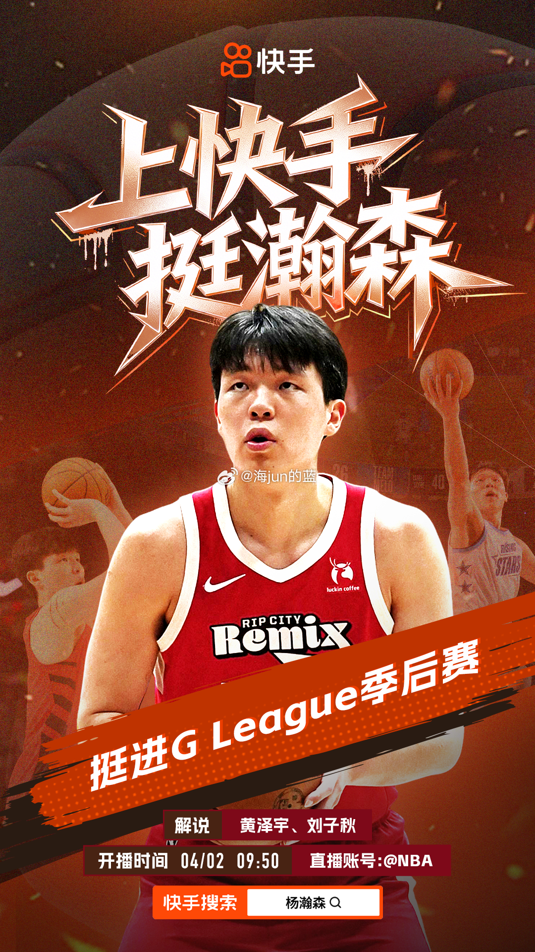 另外,明天NBA发展联盟也进入季后赛,单场淘汰的赛制大大增加了比赛的激烈度和观赏性,杨瀚森将会继续为混音队出战,明天锁定快手直播间,一起为瀚森加油!CBA杨瀚森