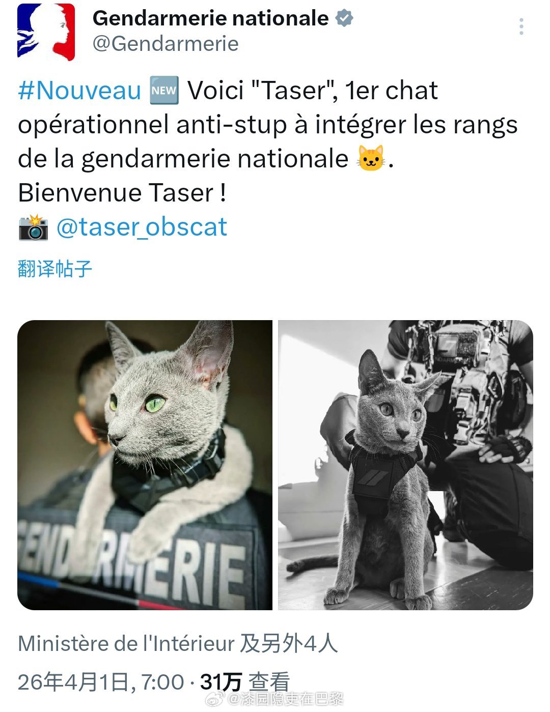 海外新鲜事 法国宪兵队发文:这是“Taser”,首只加入法国国家宪兵队、执行缉毒任务的警猫🐱。欢迎你,Taser!