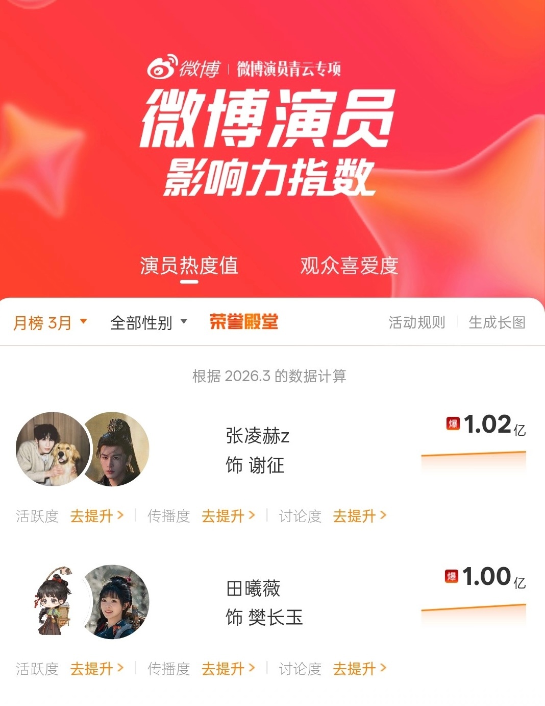田作之赫 张凌赫田曦薇顶峰相见了微博演员影响力3月月榜揭晓,张凌赫、田曦薇热度值双双破亿,我们落难侯爷和杀猪妹就这样强势登顶了!这把角色破亿热度的背后根本是爆款支持!《逐玉》这波顶峰相见是完全是杀出来的!