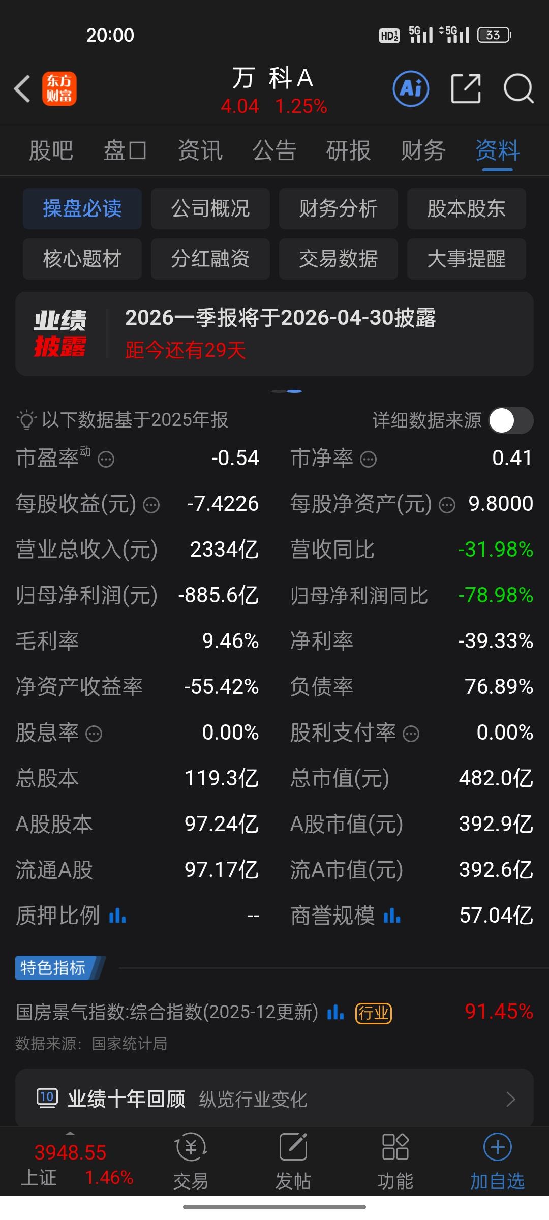 巨亏885亿!万科跌破4元,2个自己都亏没了,这几年进去的股民全部被埋! 你见过一家公司一年亏掉两个自己的市值吗? 万科做到了。 3月31日,万科正式披露2025年年报,数据触目惊心:归母净亏损885.6亿元!这比预披露时的820亿元还要狠,直接刷新了A股史上年度亏损纪录。 两年亏掉1400亿,底裤都亏没了。咱们算笔账,现在万科A的流通市值才392.6亿元,这一年的亏损额,相当于把两个万科都亏没了还有富余。 更让人头皮发麻的是,这不是万科第一次巨亏。2024年亏了494.8亿元,2025年再接再厉亏885.6亿元,两年加起来将近1400亿元。这哪是业绩下滑,这简直是业绩跳水! 钱到底亏哪儿了?万科自己解释得很清楚:高地价项目集中结算、市场下行导致毛利率被压到地板上、新增计提大额信用和资产减值。说白了,就是当年拿地太贵、现在卖房太便宜,中间全是窟窿。 从36元跌到4元,进去的股民全被闷杀。 你说股价跌成啥样?复权后历史最高价36.37元,现在呢?跌破4元,正式进入“3元时代” 。从高点算下来,跌了整整89%! 这意味着什么?近十年来进场的股民,不管你在哪个位置买的,全部被套牢。那些当年喊着“价值投资买万科”的人,现在怕是连账户都不想打开了。 曾经的地产白马股,股民眼里的“香饽饽”,如今跌得只剩一地鸡毛。 最大的麻烦还不是亏损,是钱快烧没了。 年报披露,万科2025年经营现金流净额-9.88亿元,由正转负。手头现金告急,债务却排着队等着还。管理层自己都承认:2026年到期公开债合计146.8亿元,其中4月到7月集中到期112.7亿元,兑付压力突出。 虽然2025年咬牙还了332亿元公开债,但接下来的4个月,才是真正的生死关。 你问万科还能不能逆风翻盘?我告诉你一个残酷的现实:万科现在不是在发展,是在“求生” 。 为了活下去,万科2025年干了三件事:一是拼命卖资产,全年完成31个项目大宗资产交易,回笼113亿元;二是玩命盘活存量,全年盘活货值338.5亿元;三是争取股东输血,大股东深铁集团累计提供股东借款335.2亿元。 董事长黄力平在年报里也说了实话:“当前经营形势依然严峻” 。 万科还能不能站起来?说实话,谁都给不了准话。 但有一点可以肯定:如果连万科这样的行业龙头都扛不住这轮调整,那整个地产圈,真的没有一个能笑着走出这个冬天。 现在的万科,不是以前那个教你“活下去”的万科了,而是自己在拼命“打骨折卖身”还债的万科。 在座的各位老铁,你们怎么看现在的万科?欢迎讨论一下。