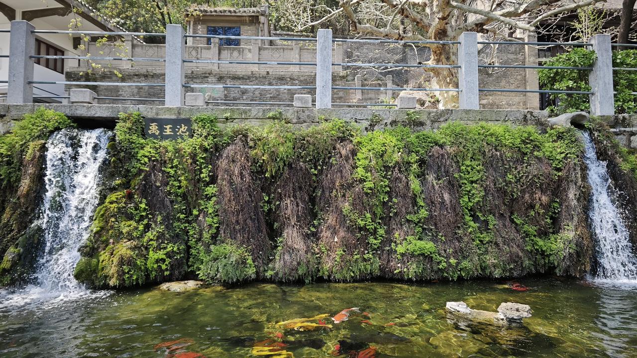 春日生活打卡季清泉叠翠映禹王,锦鲤闲游岁月长。一汪碧池藏古韵,半帘飞瀑送清凉。
