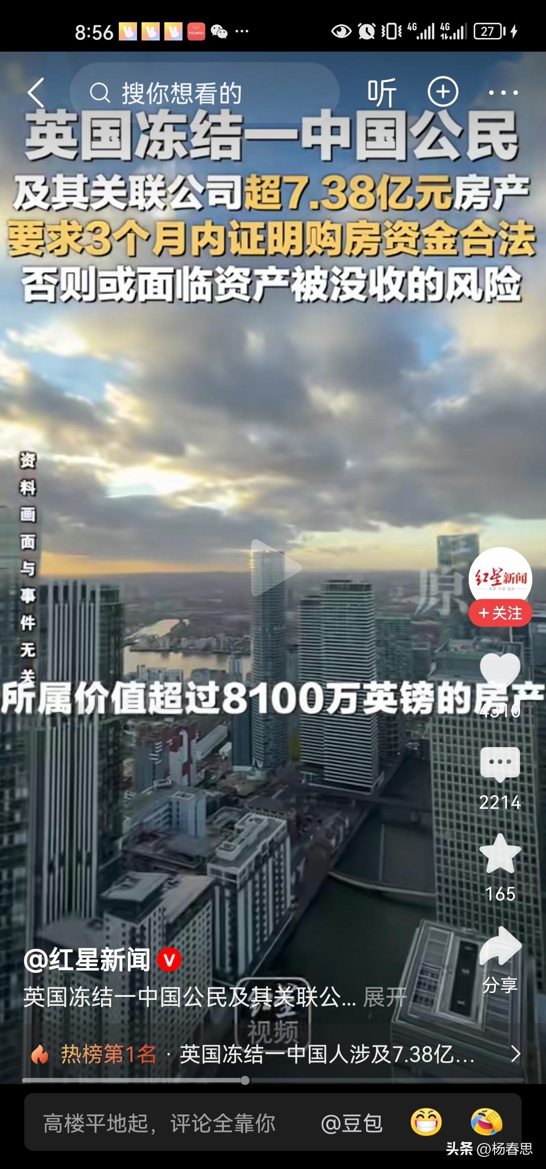 英国冻结一名中国公民及其关联公司超7.38亿元房产,要求三个月内证明购房资金合法。否则面临资产被没收的风险。希望英方把房主个人信息公布出来,助力中国反腐事业!只要资产来源不正的奸商也好,贪官也好,无论走到哪里都会被人瞧不起,别以为有了钱就是大爷。只要来路不正,到头来终究是竹篮打水一场空。