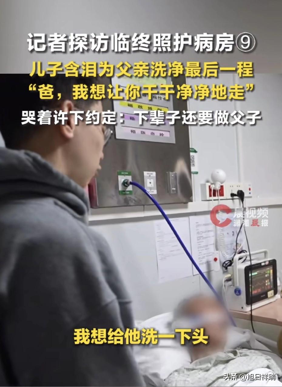 泪目!病房里儿子含泪为父亲洗净最后一程“爸,我想让你于于净净地走”。哭着许下约定:下辈子还要做父子! 我刷到这个病房视频,盯着屏幕愣了好半天,鼻子酸得发堵,眼泪没忍住就掉下来了。 这是在北京清华长庚医院的临终照护病房,老爷子躺在病床上,生命已经走到最后关头,连动弹都费劲,连回应儿子的力气都没有了。 儿子在病房里,没有嚎啕大哭,就安安静静蹲在床边,声音带着浓浓的哽咽,跟爸轻声说着话,手里拿着温热的毛巾,慢慢给父亲洗头、擦身子。 他动作轻得不能再轻,每一下都小心翼翼,生怕弄疼了毫无知觉的爸爸,一边擦一边小声念叨,没说什么父爱如山的大话,也没讲任何煽情的漂亮话。 就反反复复说着心里最实在的想法,爸,我给你洗干净点,我想让你干干净净地走。 我能想象得到,这老爷子平日里肯定是个爱干净的人,出门总要把衣服捋得整整齐齐,头发梳得顺顺溜溜。 儿子一直记着爸的这个习惯,他知道人走到最后,啥都带不走,能留一份干干净净的体面,就是自己能尽的最后一份心。 洗着洗着,儿子的眼泪止不住往下掉,一滴滴落在毛巾上,也落在父亲枯瘦的手背上,他对着意识早已模糊的父亲,哭着许下了一个约定,下辈子还要和爸做父子。 就这么一句简简单单的话,没有任何修饰,可全是掏心窝子的不舍,这辈子做父子的缘分快到头了,心里实在舍不得,还想接着陪着爸,还想再当爸的儿子。 其实好多人心里一直悬着个事,总害怕真到亲人要走的那一刻,自己除了站着哭,啥也做不了,也不知道该做些什么才能不留遗憾。 这个儿子用最朴素的行动给出了答案,不用搞那些虚头巴脑的,也不用讲多么动听的话。 就做这种平日里给家人做的小事,安安静静陪在身边,细心打理好最后的体面,就是最实在的孝心,也是给彼此最后的安慰。 我们平时总忙着工作、忙着应酬,总说等有空了再好好陪爸妈,总觉得日子还长,可时间从来不会等我们,老人的日子是过一天少一天。 别等到最后一刻才后悔,还有好多陪伴没补上,还有好多小事没做。 你有没有过想陪父母却没及时做的事?