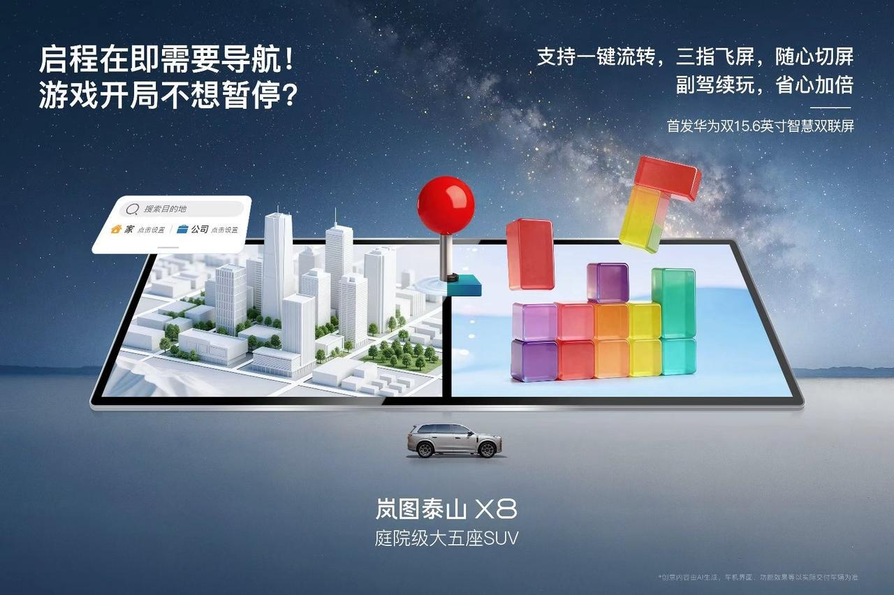 “境”“界”都没用上,岚图先用了!泰山X8官宣首搭华为双15.6英寸双联屏 【2026年3月31日,武汉】3月31日,岚图汽车官方宣布,岚图泰山X8将首搭华为双15.6英寸大双联屏。这意味着,岚图泰山X8先于“境”“界”,成为行业首款搭载华为双联屏的车型,以领先者姿态,重新定义高端家用旗舰的智能标杆。 岚图泰山X8华为大双联屏采用双15.6英寸2K显示屏,分辨率高达2560*1440,最高亮度达1000nit,在强光环境下依然清晰可视,科技豪华感拉满;各屏独立运行,支持一键流转,既能协同操作,也能互不干扰,主驾安稳奔赴远方,副驾尽享娱乐时光,真正做到“各行其道,各得其乐”。值得一提的是,副驾座椅向前折叠,二排乘客可通过调节零重力座椅,以最舒适的姿态,享受高清大屏带来的沉浸式体验。 从发布“622庭院级空间标准”,给出同级最大车内6.1㎡座舱空间、二排双享零重力座椅、2米大床,到上车120度动力电池(EV)、华为896线四激光雷达,再到首搭华为双15.6英寸大双联屏,岚图泰山X8正以一套覆盖智能、空间、舒适、动力、安全的全维度解决方案,焕新家庭出行体验,重塑高端家用大五座SUV价值新标杆。