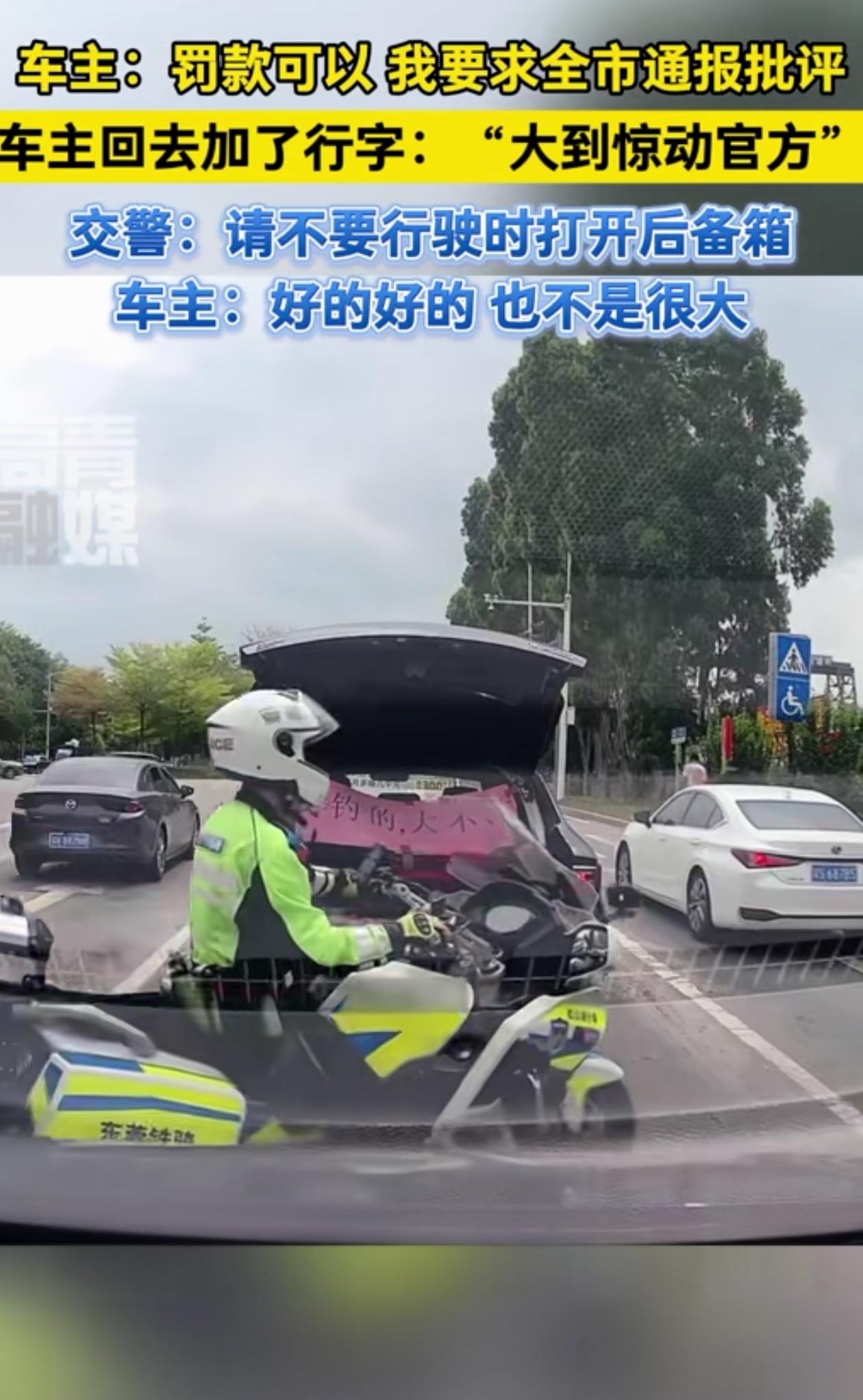 骄傲溢出屏幕了!广东东莞一车主等红绿灯时,将后备箱打开,炫耀自己钓到的大鱼,可他还没来得及高兴,旁边就走过来一个骑警,当场掐灭了他的小心机。 不得不说,这车主应该是高兴坏了,后备箱打开后能看见里头躺着条硕大的鱼,旁边还挂着条醒目的横幅,上书五个大字:“我钓的,大不大?” 那股子得意劲儿,简直要顺着后备箱溢出来,仿佛整条街都该为他这条战利品鼓掌。 可这“高光时刻”就维持了大概三秒。 一位巡逻的骑警小哥正好经过,见到这一幕没有半分犹豫,直接伸手“啪”一声,干脆利落地把那个张扬的后备箱给关上了。 随后,骑警上前对司机进行了提醒和教育,虽然没开罚单,但却让车主骄傲不起来了。 不过交警这一关,关得太对了,这可不是小题大做。 虽说车辆在等红绿灯,并没有启动,但只要在道路范围内,都属于交通参与状态。 在这种情况下,打开的后备箱盖就成了一个不稳定因素。万一那条大鱼一扑腾,真掉出来了,后车司机下意识急刹,追尾了算谁的? 就算东西没掉,高高翘起的箱盖也可能遮挡后车视线,或者给侧方车辆造成误判。 马路是公共通行空间,不是谁的个人秀场。当私人喜悦的宣泄,可能影响到公共安全时,边界就出现了。 发朋友圈可以等停好车,展示战利品可以回家慢慢拍,把道路安全让位于一时的“嘚瑟”,这笔账,怎么算都不划算。 你觉得男子该不该这么炫耀?