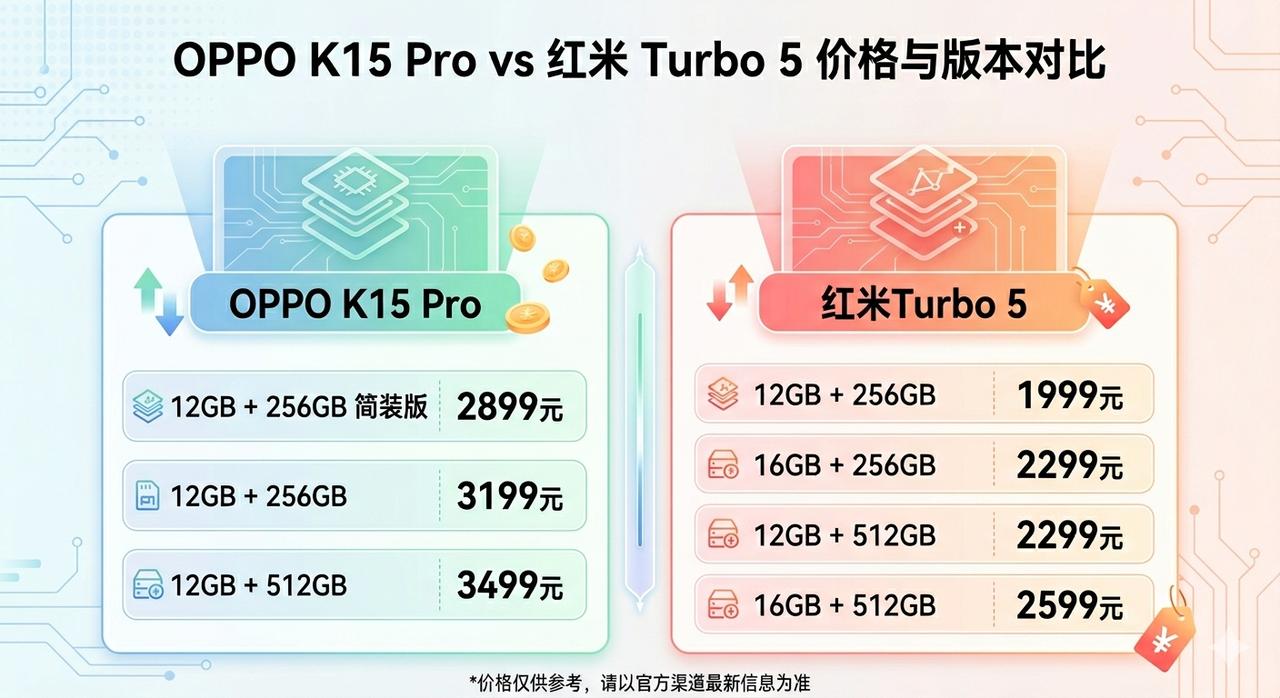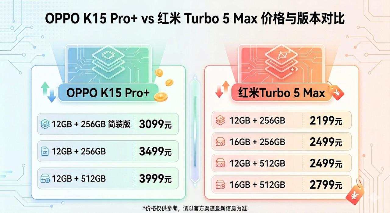 本以为OPPO这次能大干一场,结果被大干了一场,这怎么和红米Turbo 5系列打啊? 实话实说,就产品配置来说,OPPO K15 Pro和K15 Pro+还是挺不错的,足以和红米Turbo 5\Turbo 5 Ma正面硬刚,而且OPPO K15 Pro系列还多了个比较实用的主动风扇散热技术,可以带来更好的温度和性能释放水准,但谁知道OPPO这次的定价会这么离谱! 都搞出不送充电器的简装版了,结果价格还是比人家贵了900元,并且没有16GB内存版本的选择,这么大的差价对于两三千的产品来说,完全可以决出生死了,这个定价算是彻底拉跨了,被红米Turbo 5系列吊打的节奏。 当然OPPO宁愿挨骂也不愿意来个大家满意的价格,说明供应链的成本压力是真的非常大,既然如此红米那边还能扛多久呢?我估计4月份红米这边也会涨价,涨个500也不要觉得奇怪。