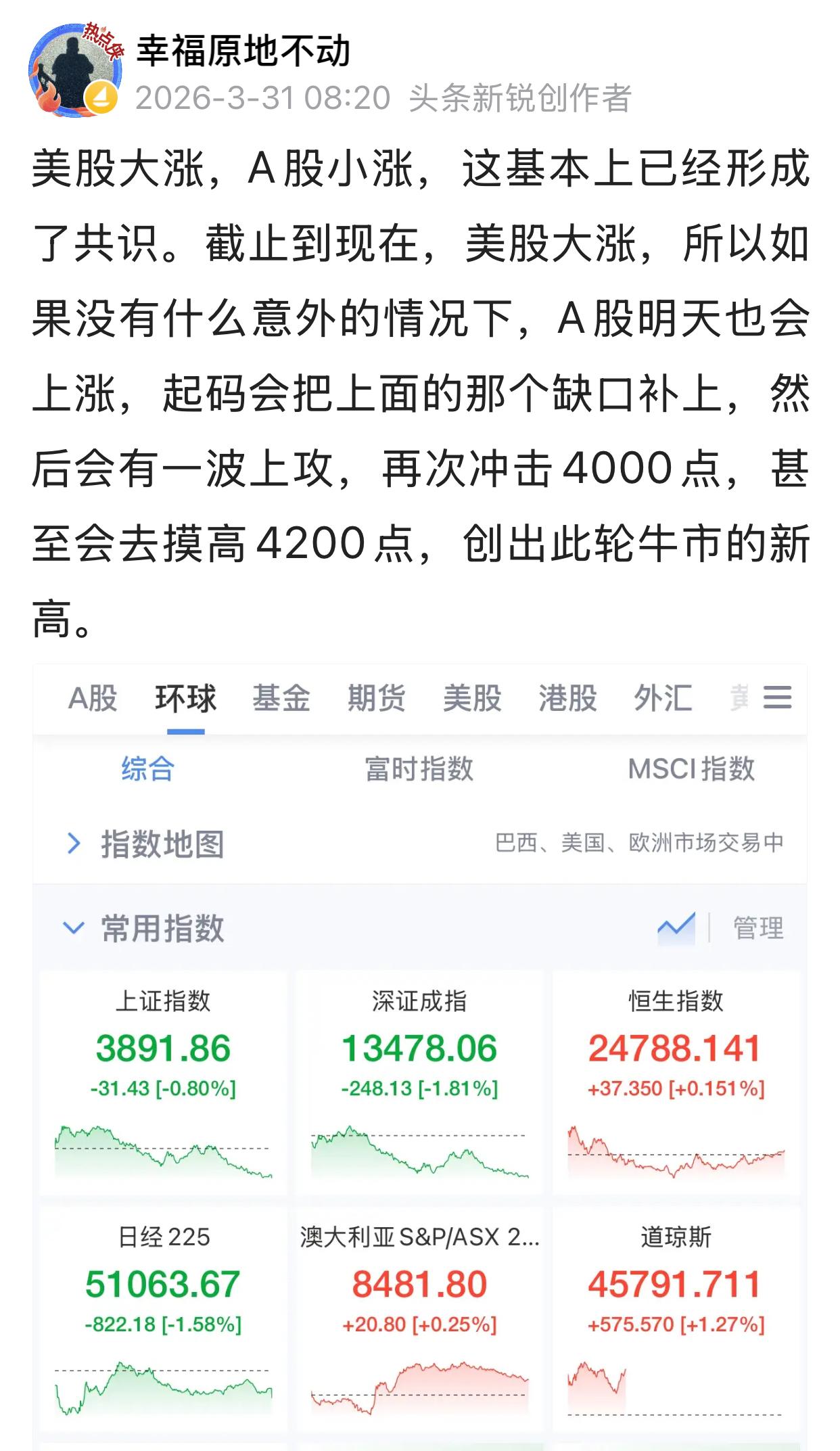 如我所说,A股上方的那个缺口终于如大家所愿,严严实实地给补上了。大多数股票都是上涨,临近收盘有小幅下跌。亚洲股市上涨,欧洲股市上涨,下面就要看美国股市行情怎么样了。如果美股仍然延续上涨趋势,明天A股依然会上涨,谨慎看多。这几天上涨过快的股票,会有反复,今年以来没有上涨甚至下跌很多的股票还会有一轮补涨,千万不要急于出手。股市收盘解析 A股波动风险 周二股市行情 A股五连涨 下一个目标是冲击4000点,过程中,很有可能会有小幅下跌,然后继续上涨。