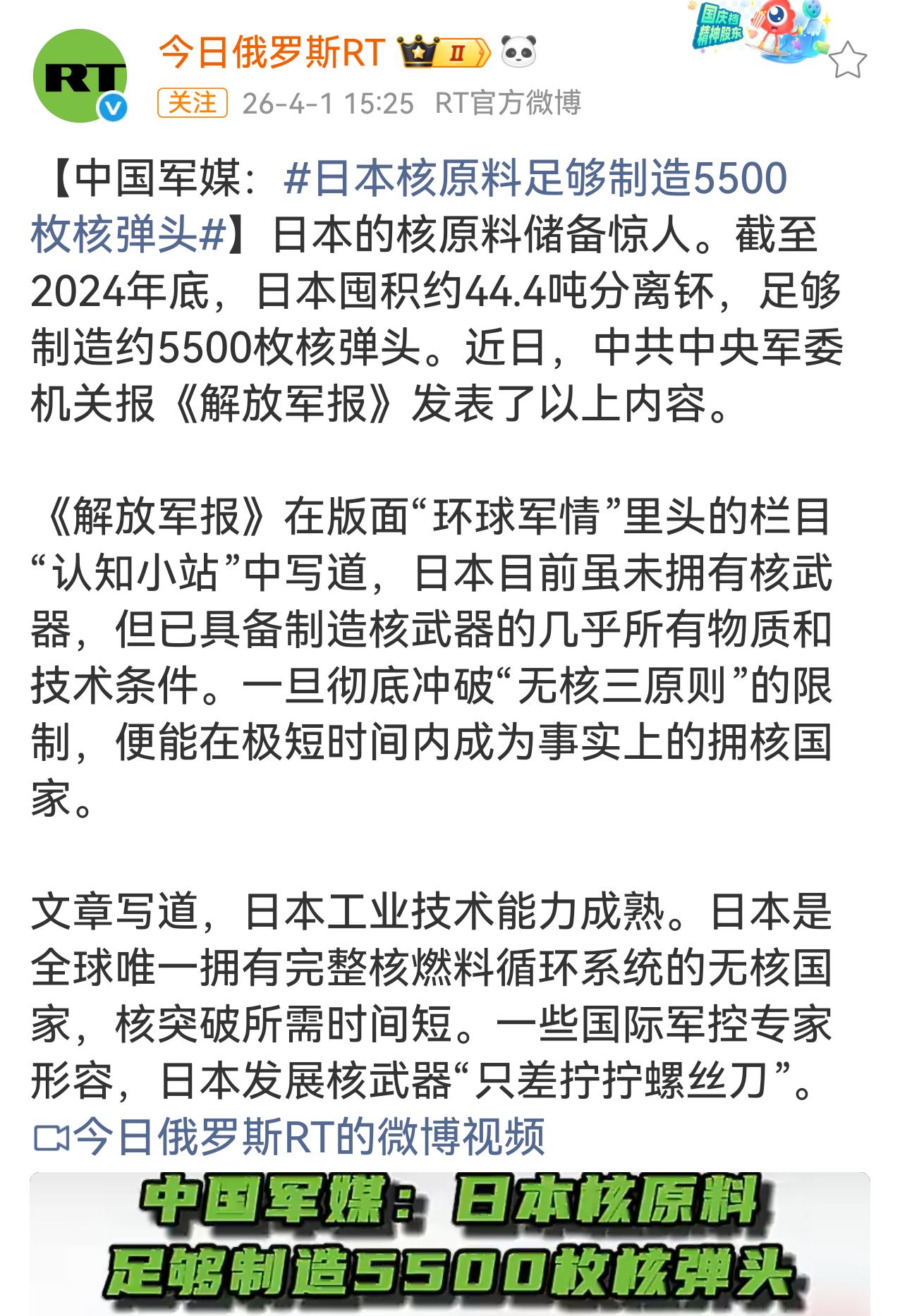 今天看到有关小日本的报道,越看越心惊。 一,小日本部署了导弹,射程超过了1000公里,可以攻击我国从东北到东南的广大沿海地区。 二,小日本拥有的核材料可以制造5500枚核弹头,只要日本愿意,极短的时间内就可以制造。 所以,让我们老百姓看到这些,除了恐惧就是恐惧,不自觉的就想到了南京大屠杀。小日本这种灭绝人性的东西,如果有核武器,他们真敢朝扔。这咋办?先发制人,立刻、马上、迅速把小日本给灭了吧。
