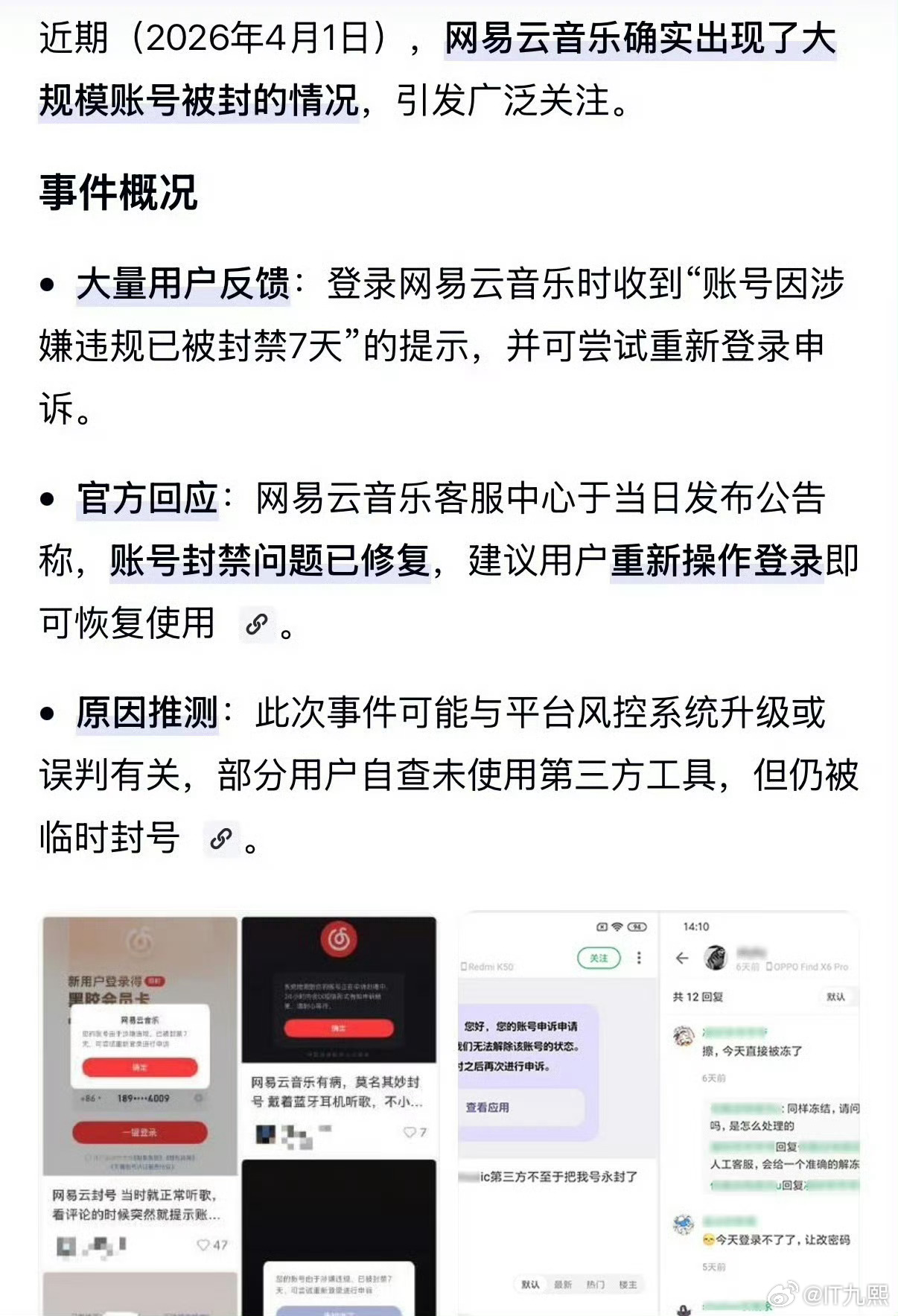 网易云封号官方给出的回应是“系统技术故障”,目前已经修复。