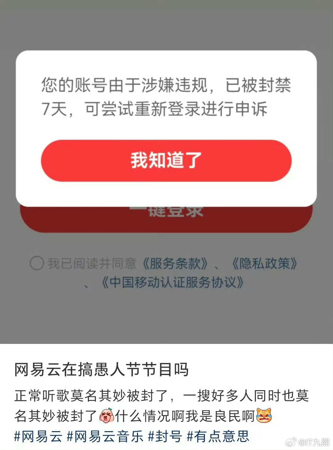 看了一圈,网友的猜测五花八门,有说是接入OpenClaw导致误封的,有说裁员裁到“大动脉”导致误封的,还有说今天“愚人节”网易云跟大家开个系统性玩笑