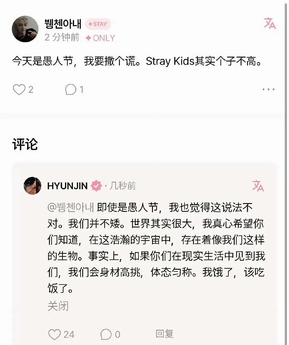 黄铉辰回应愚人节“个子矮”玩笑“即使是愚人节,我也觉得这说法不对。我们并不矮。世界其实很大,我真心希望你们知道,在这浩瀚的宇宙中,存在着像我们这样的生物。事实上,如果你们在现实生活中见到我们,我们会身材高挑,体态匀称。我饿了,该吃饭了。”