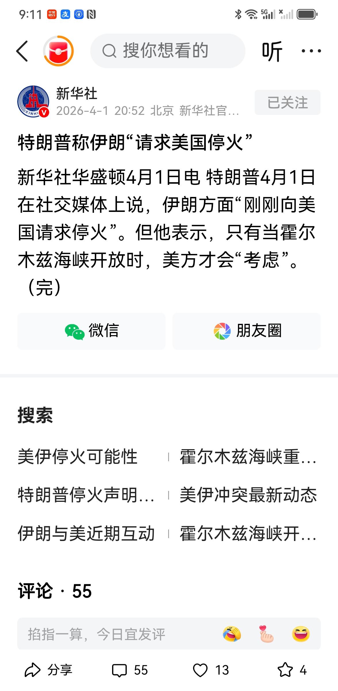 中国人经常讲一句话。人要脸,树要皮。人要不要脸?天下无敌。这句话就是说的美国的皇帝董王。 真的是人要是不要脸啊,天下无敌。战争都打成这个熊样了。上午还说要准备撤军了。这到晚上了。美国总统特朗普又发了一条信息,这是美国总统特朗普说的。伊朗请求美国停火。而且特朗普还说。只有当霍尔木斯海峡开放时,美国才会考虑停火。中国人经常讲的一句话,一个人说话不算话的时候,他说的任何话都不要相信。他说的话都当成是放屁。真的应验了外界对特朗普的看法。现在除了伊朗能打败美国之外。能打败美国的只有特朗普。能打败上午的特忙谱的只有下午的特朗普,[捂脸][捂脸]