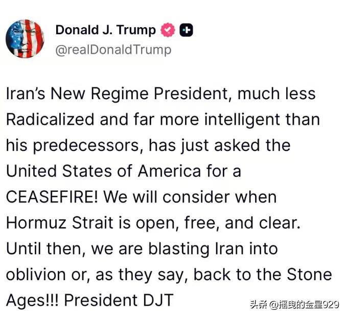 特朗普准备跑路撤军,希望不是愚人节笑话。 美国总统特朗普在其社交媒体发文表示,伊朗新任总统已提出停火请求,但最终是否同意停火还要取决于霍尔木兹海峡能否重新开放。 特朗普说,“伊朗新任总统……刚刚向美国提出了停火请求!我们会在霍尔木兹海峡恢复通航、变得安全无虞之后再考虑此事。”特朗普在Truth Social上说道。 “在此之前,我们会把伊朗彻底摧毁……让它回到石器时代去。”他补充道。 特朗普随后还表示,美国“会很快离开伊朗”,但如有必要,可以再次返回伊朗进行“打击行动”。 特朗普还表示,计划在向全国发表演讲之前,考虑让美国退出北约。 不过稍早些时候,伊朗伊斯兰革命卫队表示,霍尔木兹海峡将继续对伊朗的“敌人”关闭。霍尔木兹海峡的局势也完全处于伊斯兰革命卫队海军力量的掌控之下,绝不会让的敌人进入该海峡。 另外,伊朗议会国家安全委员会主席易卜拉欣·阿齐齐在早些时候也警告称,“美国将无法再次获得通过霍尔木兹海峡的通道。从现在起,只有那些遵守伊朗规定的国家或船只,才能被允许通过这一重要海峡。” 易卜拉欣·阿齐齐在强调,“霍尔木兹海峡未来肯定会重新开放,但不会对你们开放;只有那些遵守伊朗新法规的人才能通行。 47年的接待工作就此结束了”