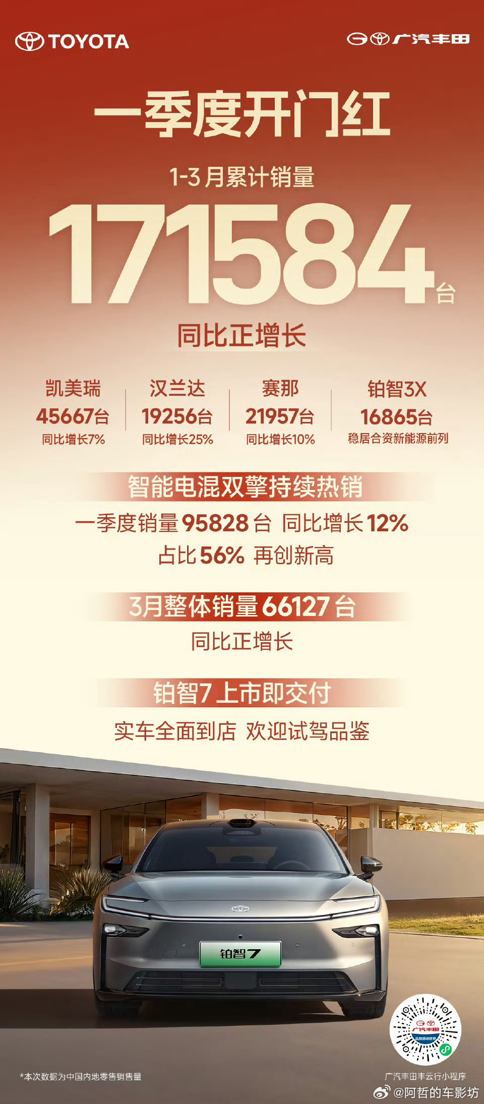 广汽丰田第一季度累计销量171584台凯美瑞销量依旧可观塞那、汉兰达、铂智3X都是热销车型接下来看铂智7的表现了