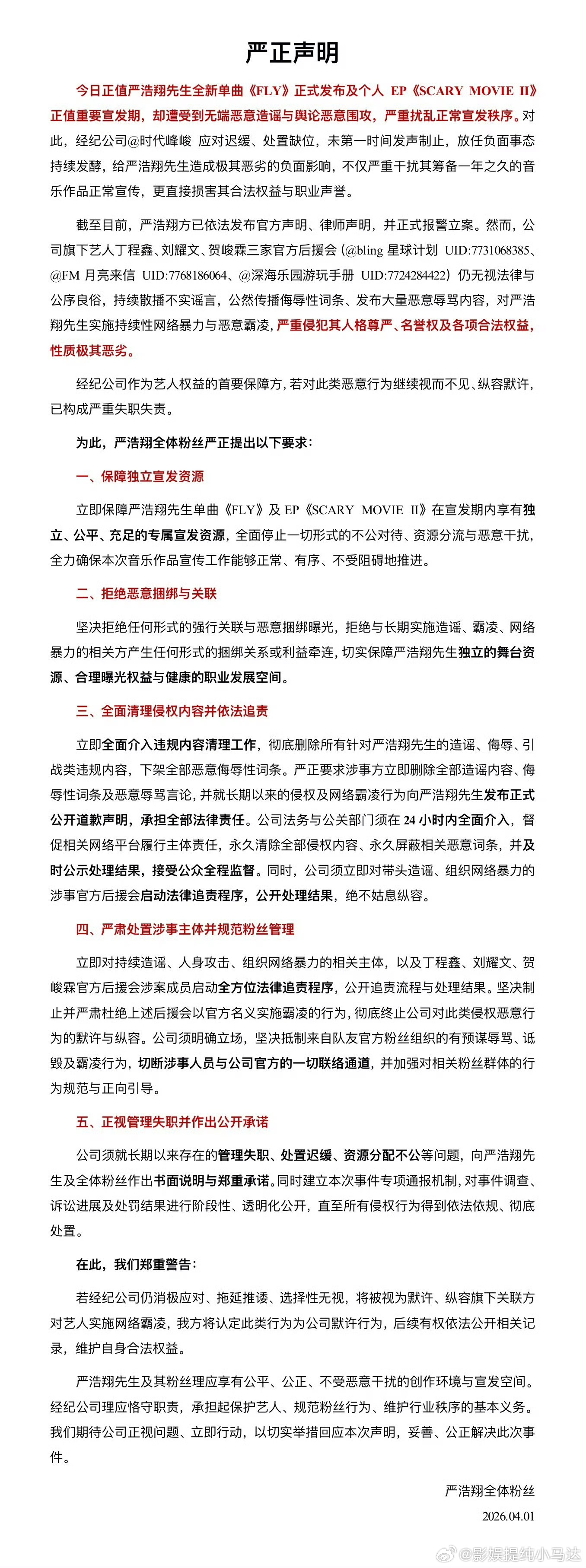 严浩翔后援会声明在严浩翔新歌《FLY》发布前这段时间,那么多关于严浩翔的舆论满天飞,严浩翔和盐汽水承受了太多不公平的对待,支持严浩翔后援会『严正声明』