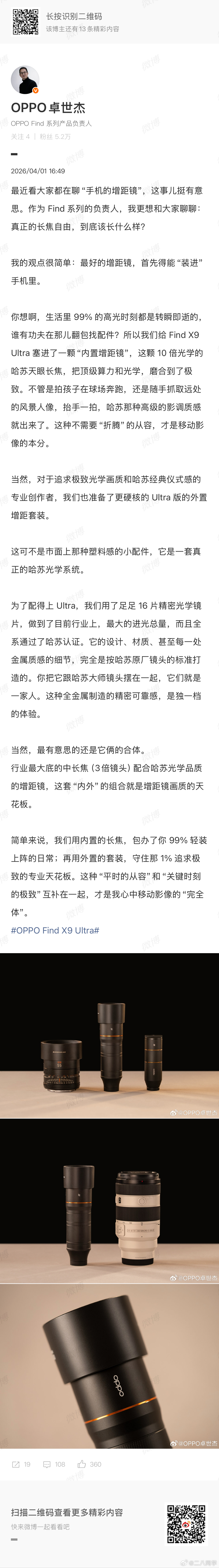 “OPPO FindX9Ultra内置的长焦,包办了你99% 轻装上阵的日常;再用外置的套装,守住那1%追求极致的专业天花板”