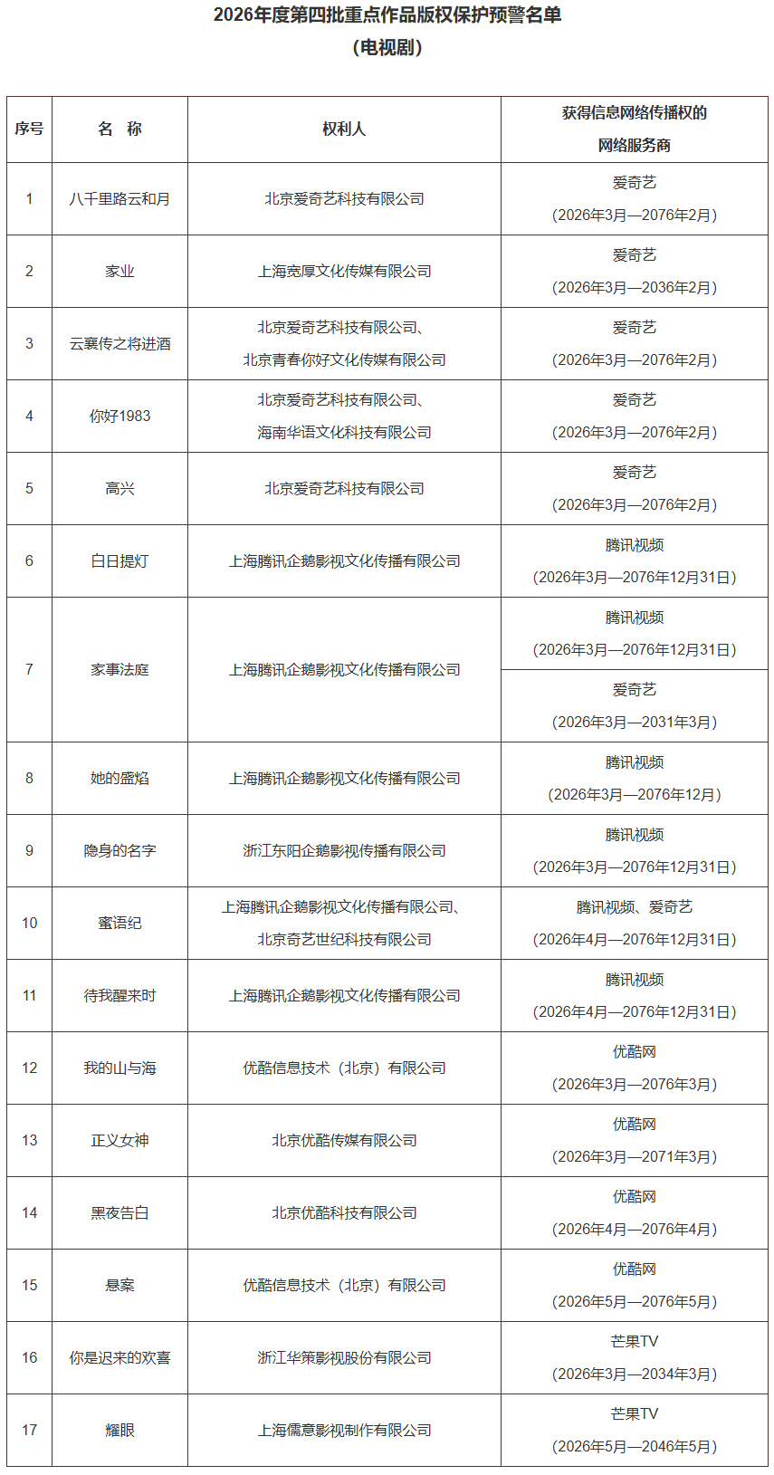 2026年度第四批重点作品版权保护预警名单有迪丽热巴《白日提灯》是不是说明推广受限,二创很容易被下架?