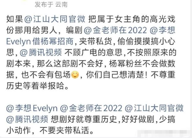 杨幂《江山大同》应援物料被撤! 杨幂《江山大同》即将开机,粉丝给杨幂准备了开机应援,不过被剧组给撤了,粉丝开始找剧组维权,不少粉丝觉得剧组这么做是为了照顾其他没钱搞应援的演员的自尊心才撤的,现在已经从应援被撤上升到不尊重历史,魔改剧本,骗杨幂签阴阳剧本的高度了,好好地一部重大历史题材剧,已经被撕成流量剧的氛围了,既然要走重大历史正剧路线,就不该搞粉丝应援那一套,格格不入。