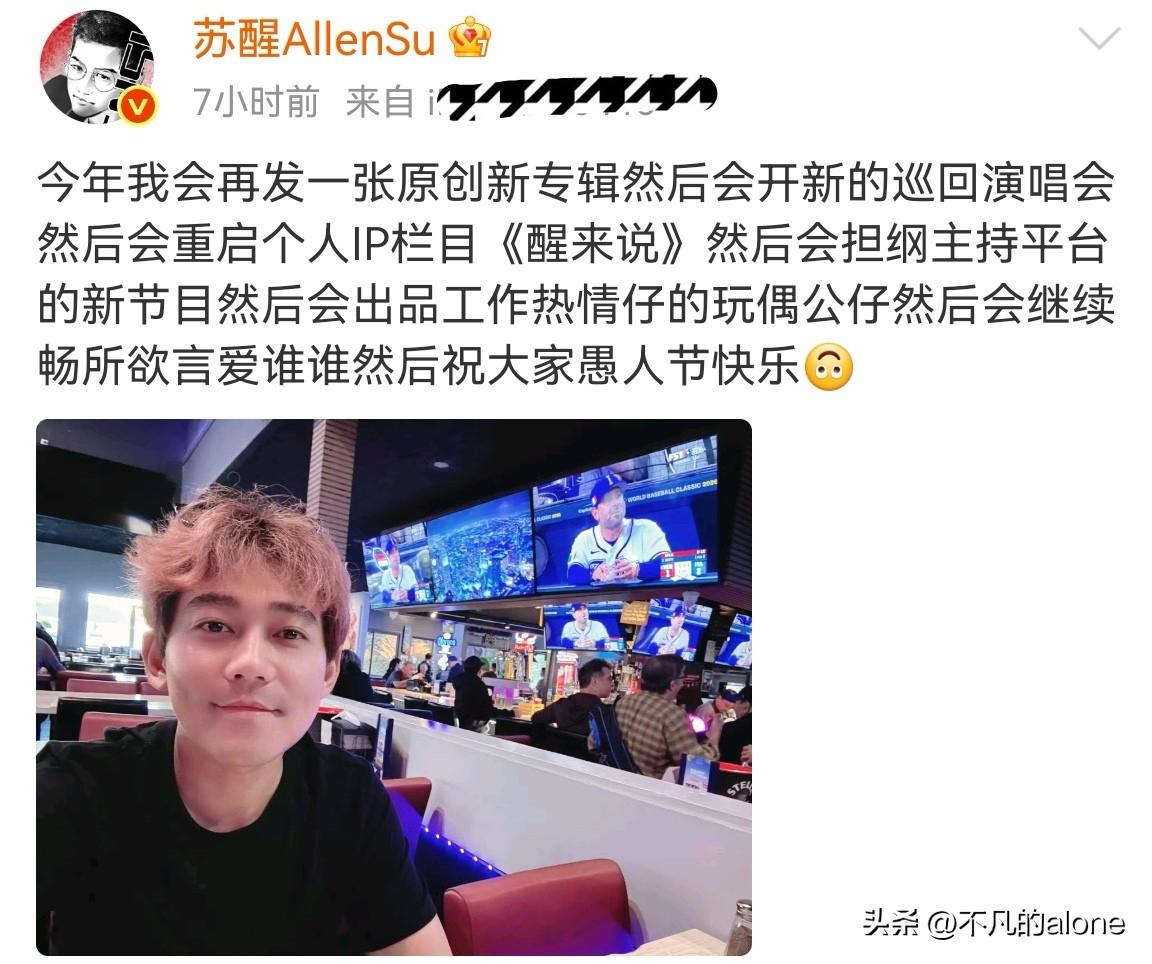 虽然今天是愚人节,但苏醒说的话我当真了。 4月1日,苏醒更新日常动态,他透露了今年的工作计划,我们一起来看一看吧。 一:发新专辑; 二:开巡回演唱会; 三:重启个人IP栏目《醒来说》; 四:主持平台新节目; 五:出品玩偶公仔。 我觉得醒哥说的都是真的,因为他去年考了主持人证,并与湖南卫视达成深度合作,大家觉得呢?