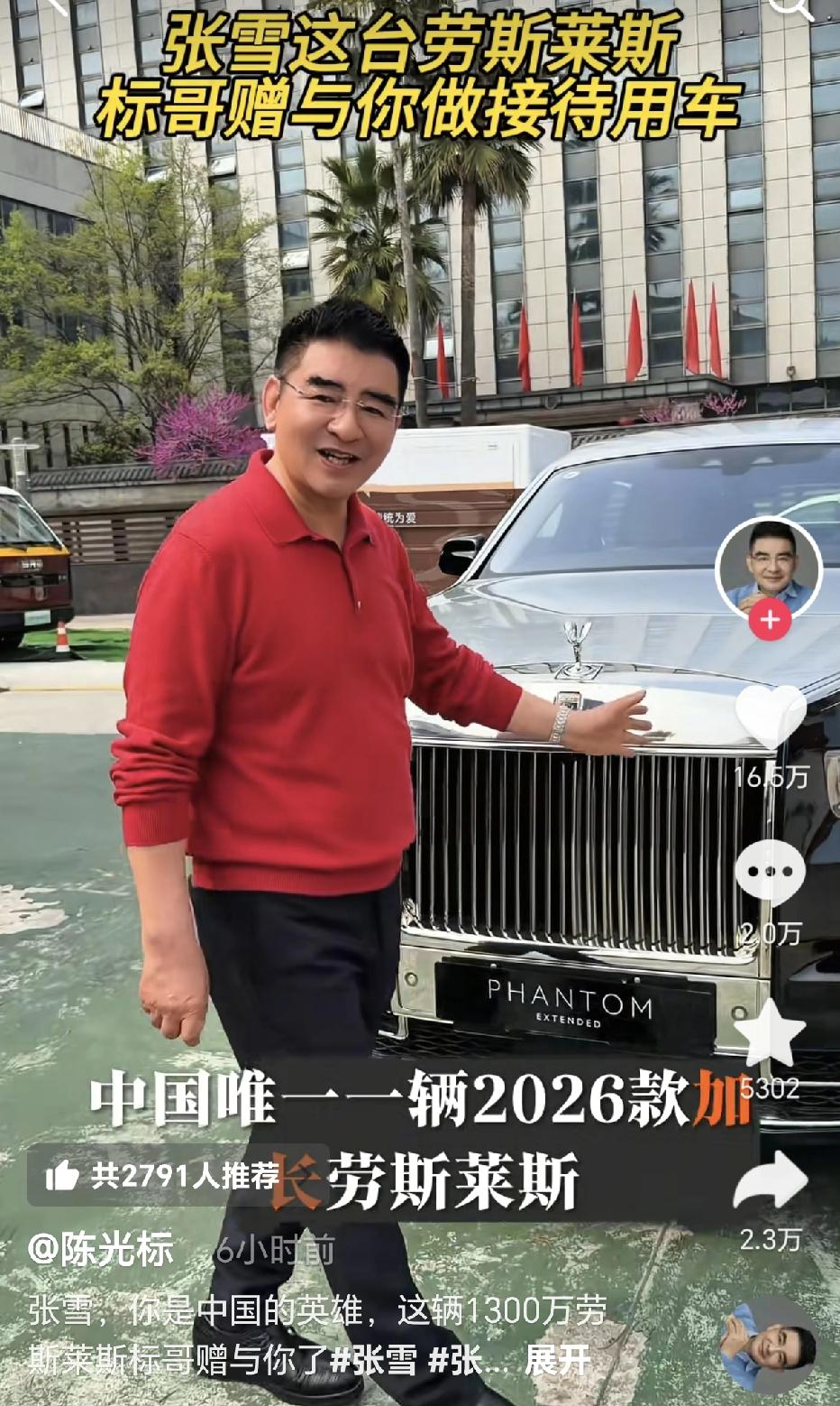 牛啊!张雪机车连夺2冠军,慈善家陈光标就站出来了,他发视频称要把全国唯一一辆的加长版劳斯莱斯赠予张雪。真的是你若盛开,蝴蝶自来。 4月1日,慈善家陈光标发布视频说张雪太牛了,说张雪带着中国机车在世界顶级赛场上连夺两冠,打破了国外的垄断,这是咱们中国制造的骄傲,是中国的英雄。 为了表彰张雪为中国机车做出的贡献,陈光标称要把公司刚购买的中国唯一一辆2026款价值1300万的加长款劳斯莱斯幻影赠予张雪。让张雪作为接待用车,目前这辆车已经到达南京,他表示想通过媒体联系上张雪,把车赠予给他。 张雪这边还没有做出任何回应,张雪是否会接受赠予,目前还不得知。 但是网友建议张雪把车收下,然后变现作为研发资金投入。 这是企业家之间的惺惺相惜,只有经历过创业至暗时刻,才能懂得成功来之不易 。对于张雪来说,一辆劳斯莱斯他确实值得,确实也能称得上是英雄。