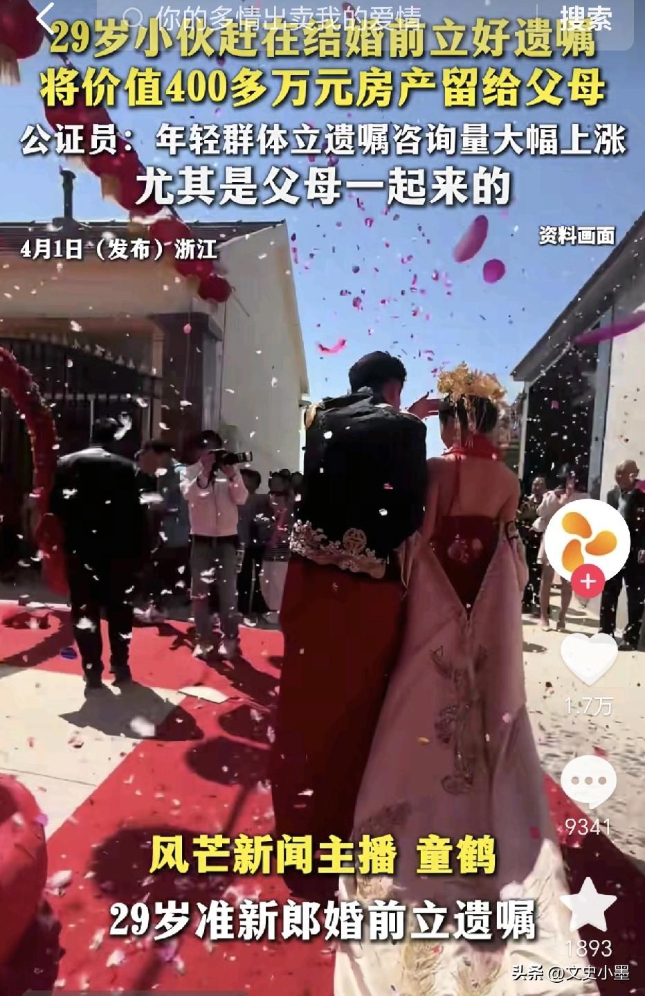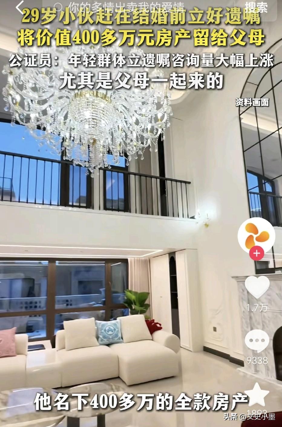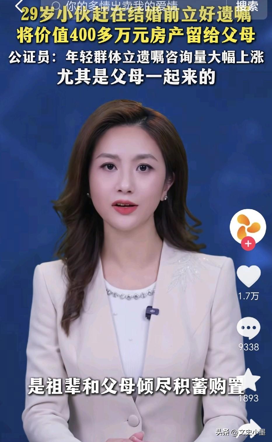 浙江宁波,一29岁男子计划今年5月份举行婚礼,然而在结婚前他做了一件大事,去当地公证处办理了一份遗嘱公证。遗嘱表明:如果自己将来发生意外不幸去世,在没有子女的情况下,这套价值400万元的房产归自己父母所有! 原来,男子的这套全款婚房是其父母和祖辈倾尽所有才购置的,他把房产留给父母可能也是为了等他们老了,要是没人照顾,能利用这笔钱安度晚年吧! 近年来,在婚前立遗嘱公证的年轻人越来越多,说明他们活的比较通透,这样可以确保将来这些遗产能够按照本人意愿分配,避免产生一些不必要的纠纷! 当然,也有一些人不理解这件事,认为都是一家人了,何必分的那么清楚,还没结婚便做了遗嘱公证,显得很冷漠,双方互相不信任! 其实,在做遗嘱公证前,最好是与女方进行沟通好,坦白说明自己做公证的目的,希望得到女方的理解!不然,以后让女方知道了,麻烦更多!