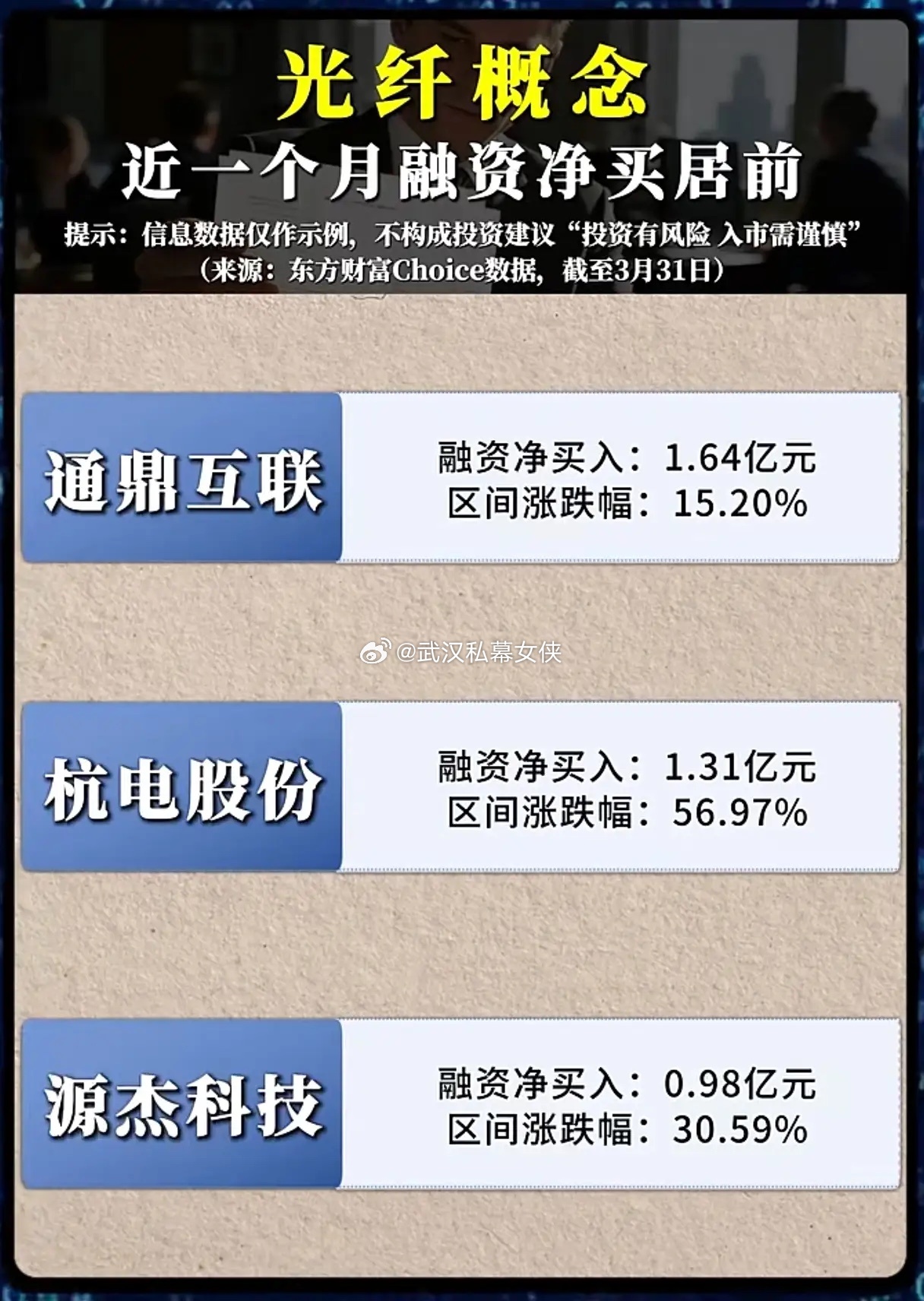 融资狂买20亿!光纤板块暴涨56%,AI算力+技术突破双杀,谁是下一个翻倍龙头?谁能想到,2026年开年A股最被低估的赛道,竟是藏在AI算力底层的光纤板块!截至3月31日,亨通光电单月融资净买入超10亿,杭电股份区间涨幅高达56.97%,长飞光纤、源杰科技等多股涨幅超30%,整个板块用真金白银的买入和实打实的涨幅,给所有投资者上了一课:光纤从来不是“夕阳产业”,而是AI时代的“数字基建主动脉”。这波行情绝非资金炒作,而是两大核心逻辑共振的必然结果。第一条,是AI算力需求的“超级爆发”与技术突破的双向赋能。3月24日,中国信科集团联合团队实现2.5Pb/s超大容量实时光传输,刷新全球纪录,相当于一根光纤每秒可传输1.4万部4K电影,直接打破了传统光纤的传输瓶颈;同时OFC 2026大会明确,1.6T光模块正式进入量产商用元年,3.2T超高速光模块完成全栈验证,AI数据中心对高速光纤的需求呈指数级增长。就像图片里的亨通光电、长飞光纤,作为全球光纤前三的龙头,完美踩中AI算力基建的风口,融资资金疯狂抢筹,股价自然一飞冲天。第二条,是国家“毫秒用算”政策的强力加持与国产替代的黄金窗口期。工信部近期启动城域“毫秒用算”专项行动,要求新建智算中心光器件国产化,直接拉动国内光纤产业链的订单量暴涨。随着AI、云计算、工业互联网的全面普及,算力网络对低时延、高带宽的要求达到历史峰值,而国内厂商在空芯光纤、多芯光纤等新型技术上已实现全球领跑,产能占全球60%以上,正全面抢占全球市场份额。杭电股份、光迅科技等企业在高端光器件、特种光纤领域的突破,正是国产替代的缩影,业绩与股价的双升,是市场用真金白银投出的信任票。再看图片里的个股,更能读懂市场的选择:从亨通光电10.18亿的融资净买入,到杭电股份56.97%的区间涨幅,从长飞光纤33.80%的暴涨,到通鼎互联15.20%的稳健上涨,无论市值大小,只要踩中AI算力+国产替代的主线,都迎来了估值重估。这不是短期行情,而是行业景气度的真实映射——AI的每一次算力升级,都需要光纤网络的底层支撑;全球供应链的每一次重构,都给国内厂商创造了弯道超车的机会。当然,我们必须清醒:涨幅过大的标的需警惕回调风险,投资永远要敬畏市场。但不可否认的是,光纤行业正站在AI算力、政策红利、技术突破的三重风口上,这是一场由数字经济驱动的产业升级,而非短期资金炒作。对于投资者而言,与其追高已经翻倍的个股,不如深挖那些在高端光纤、光器件、新型技术上有核心壁垒的企业,抓住这轮产业周期的红利。毕竟,在AI时代,所有的算力狂欢,最终都要落地到每一公里光纤上。这波行情,才刚刚开始。
